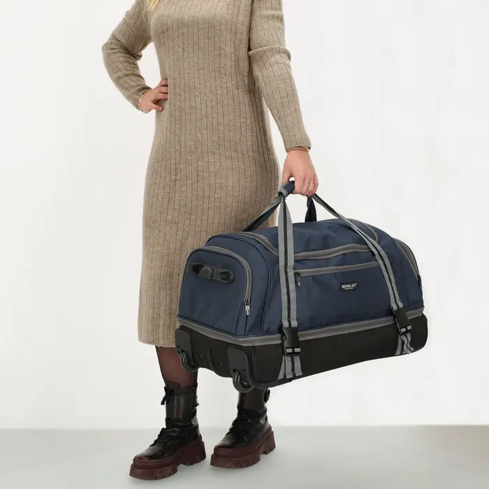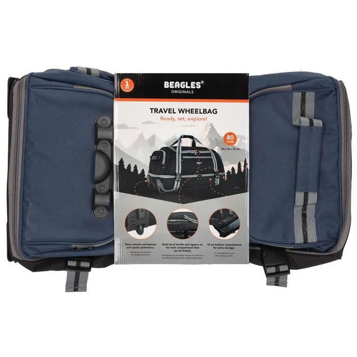 Ontdek deze fijne weekendtas op wielen van Beagles Originals. Deze grote reistas heeft een royaal hoofdvak, handige zijvakken en een extra opbergruimte onderin de tas, allemaal afsluitbaar met een stevige ritssluiting. Door de vele vakken biedt deze tas voldoende ruimte voor alle reisbenodigdheden. De tas kan op verschillende manieren gedragen worden: door de trekstang, de lange schouderbanden of het extra handvat.