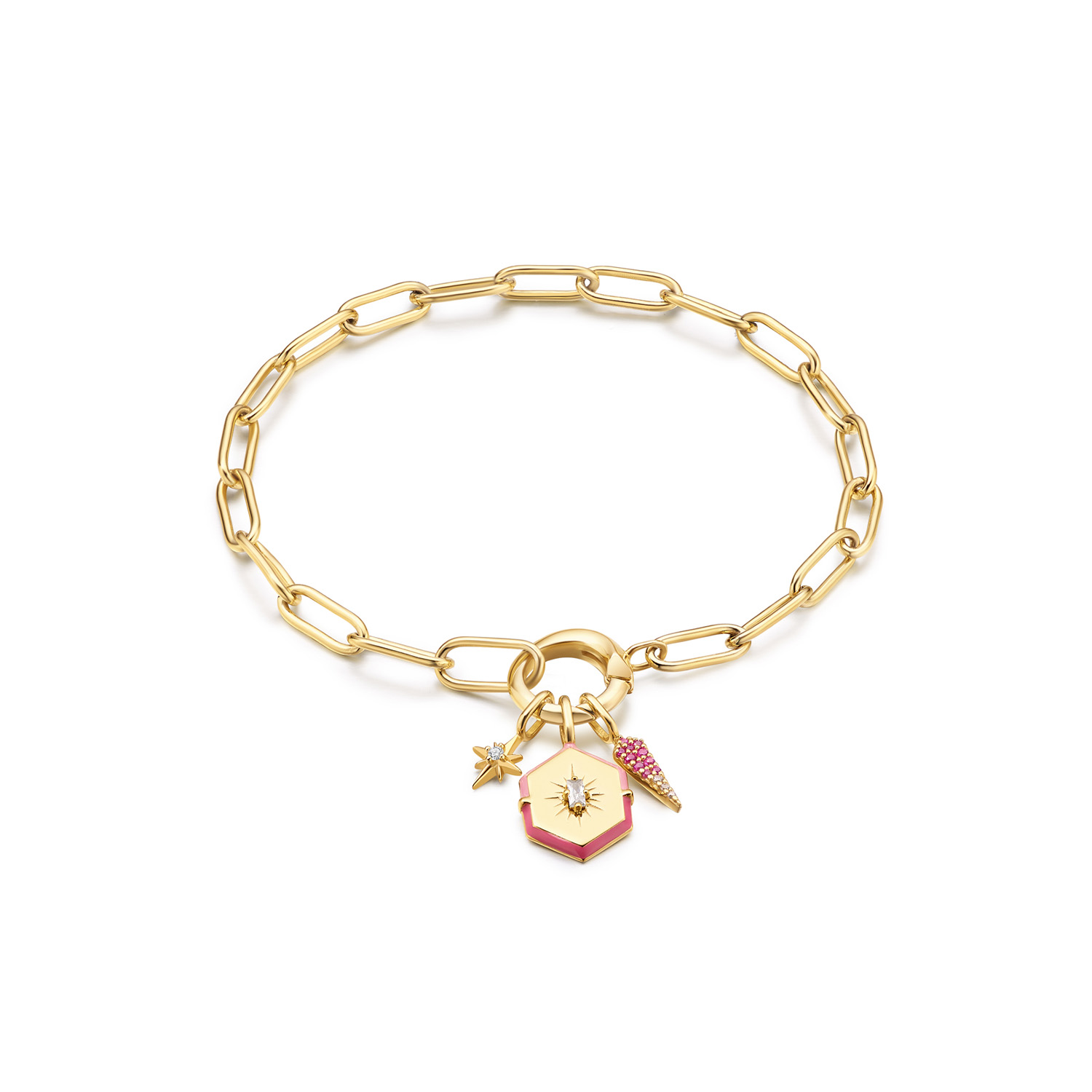 Geef je ketting een upgrade met deze knal roze bedel. De bedel bevat roze emaille randen, een sprankelende zirkonia steen en is gemaakt van 925 sterling zilver met 14 karaat gouden plating. Bevestig je bedel eenvoudig aan een kettng, armband of connector.