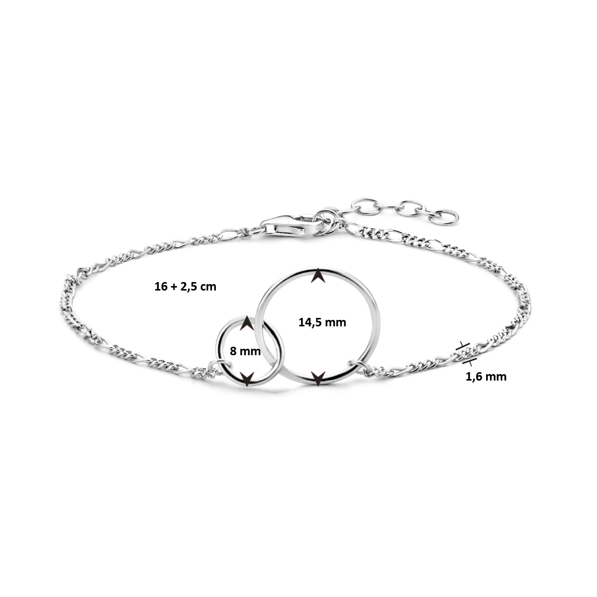 Gerhodineerd 925 zilveren figaro armband uitgevoerd met twee ronde hangers. De armband heeft een draaglengte van 16.5cm met een extensie van 2.5cm. De schakelbreedte is 1.6mm.