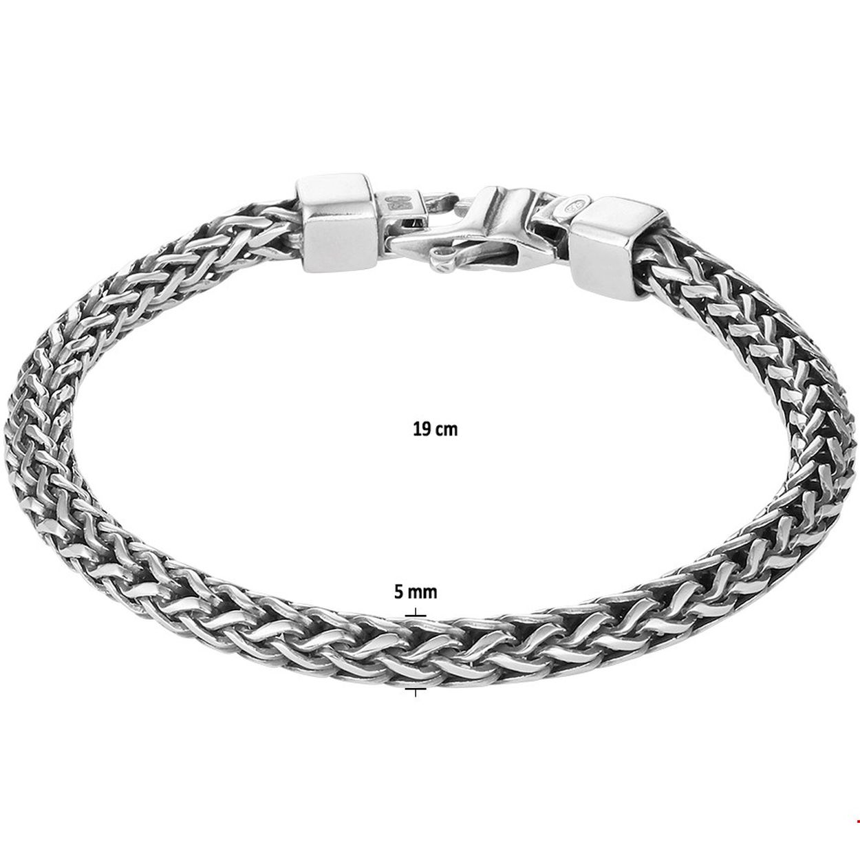 Beschrijving: Geoxideerd zilveren armband met een draaglengte van 19cm en een schakelbreedte van 5mm. De armband is uitgevoerd met een stevige karabijn sluiting.