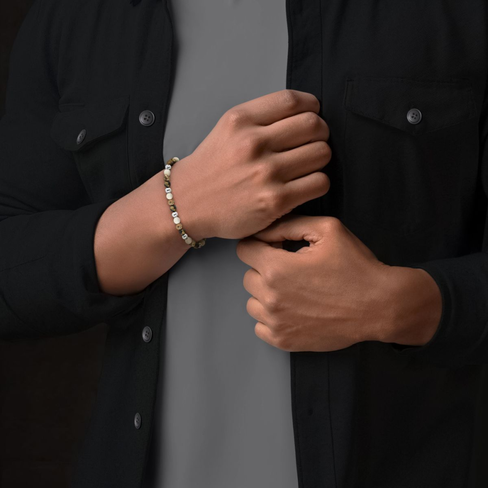 Edelstenen bead armband, handgemaakt van 6mm stenen (Fossil, Jaspis, edelstaal en Tijgeroog) met een zilverkleurige sluiting. Het Rebel & Rose sieraad is makkelijk te combineren met onze andere kralenarmbanden.