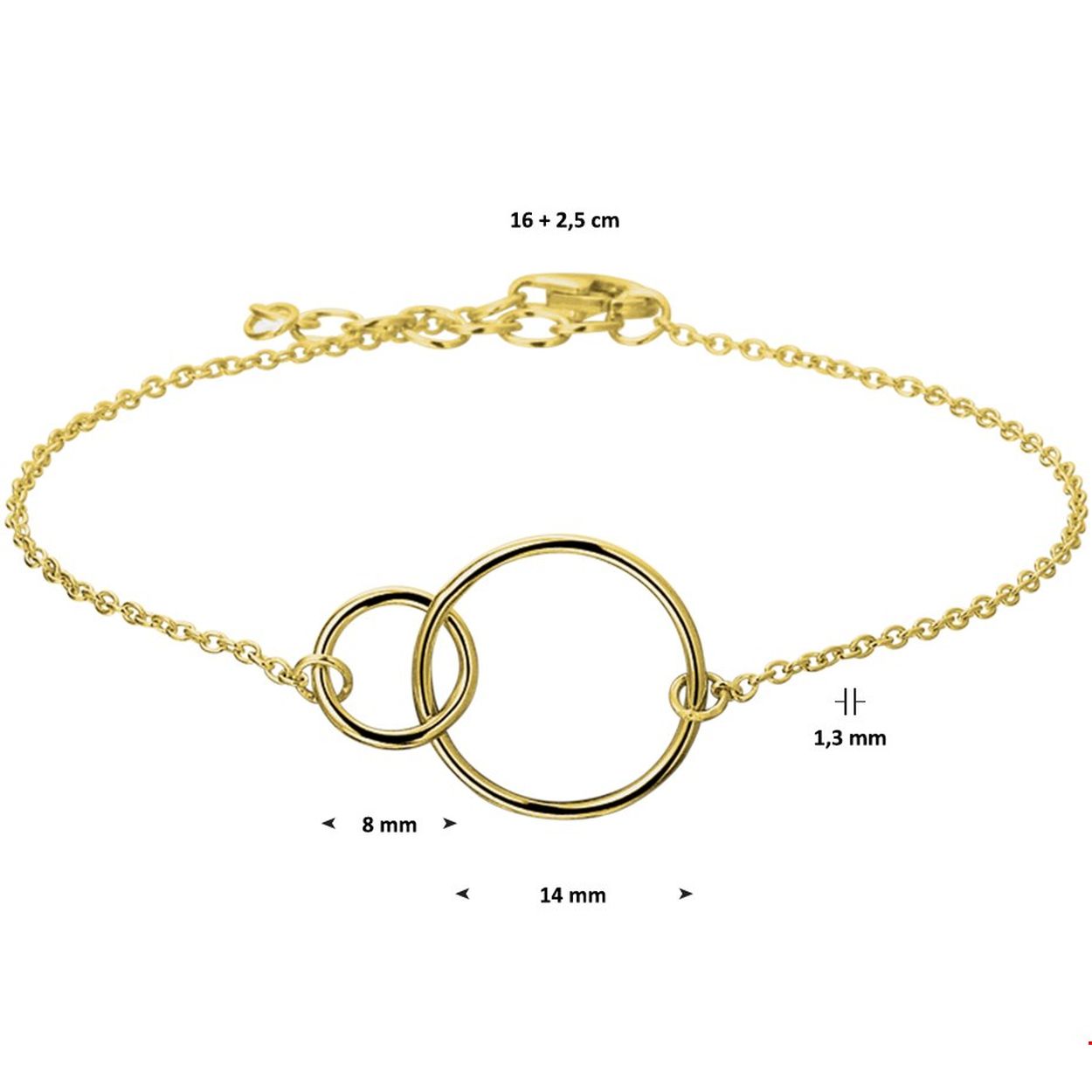 Beschrijving: Trendy geelgoud op zilveren armband uitgevoerd met twee open cirkels van 8 en 14mm en een stevige karabijn sluiting. De armband heeft een draaglengte van 16cm met een extensie van 2.5cm.
