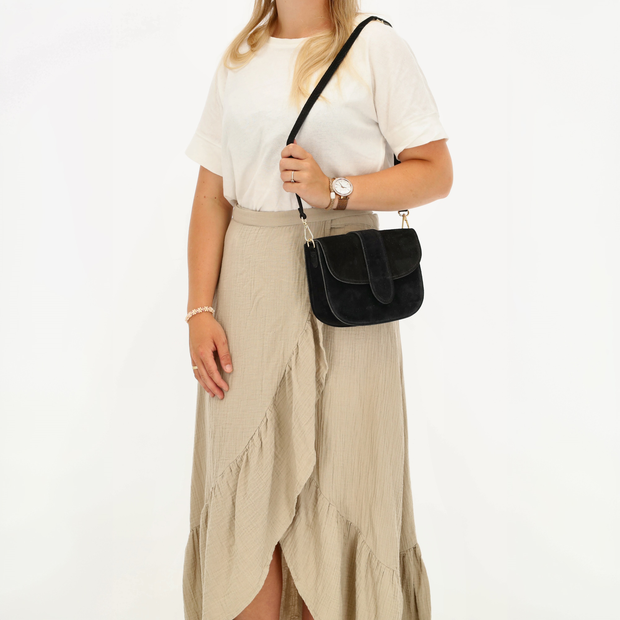 Deze Charm London suede schoudertas heeft een klassiek en elegant design met gouden accenten en een verstelbare schouderband. De tas heeft een ruim hoofdvak en een extra vakje met ritssluiting aan de binnenkant. Draag deze tas over je schouder of crossbody voor een stijlvolle look die perfect is voor dagelijks gebruik. Met deze tas maak je zeker een fashion statement!