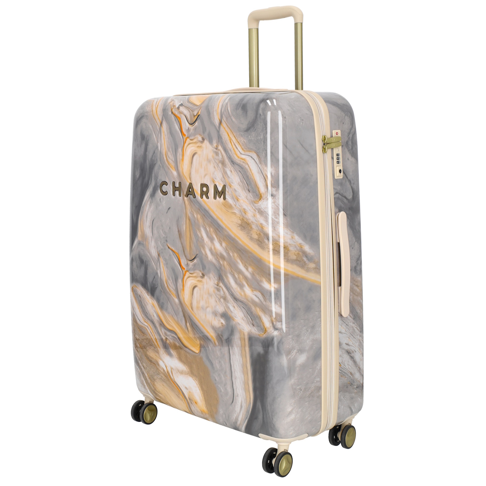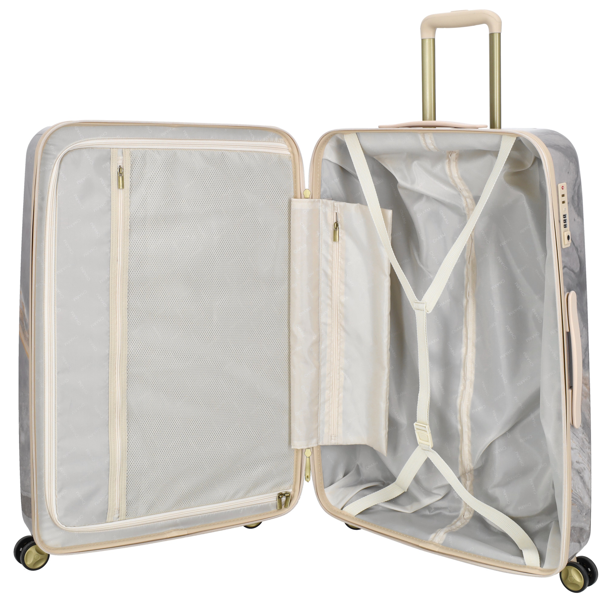 De Charm London Travel Koffer - 026 Lichtgrijs marmer heeft een stijlvol en trendy ontwerp met marmerprint. De koffer is voorzien van een stevige handgreep, vier spinnerwielen en een uitschuifbare trekstang. Het interieur heeft handige vakken en riemen om je spullen georganiseerd te houden. Draag deze koffer met trots op al je reizen en laat je stijl zien aan de wereld.