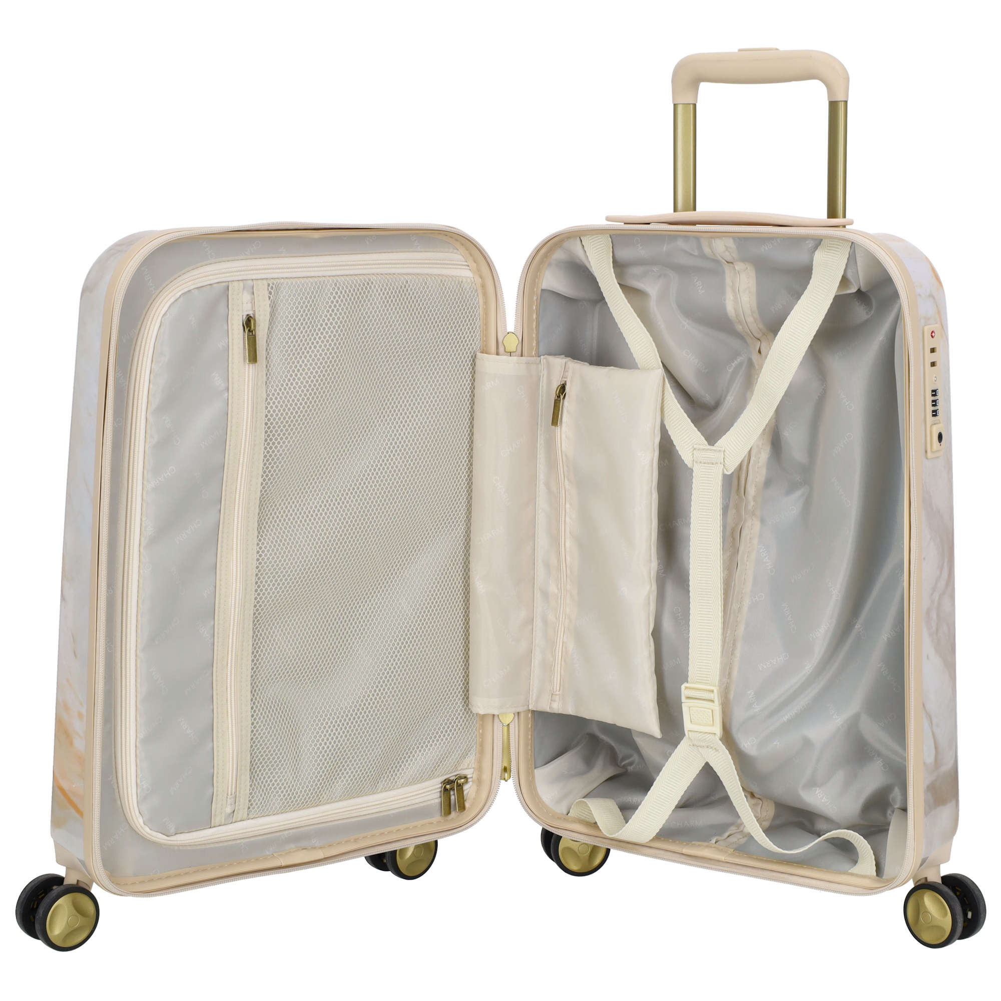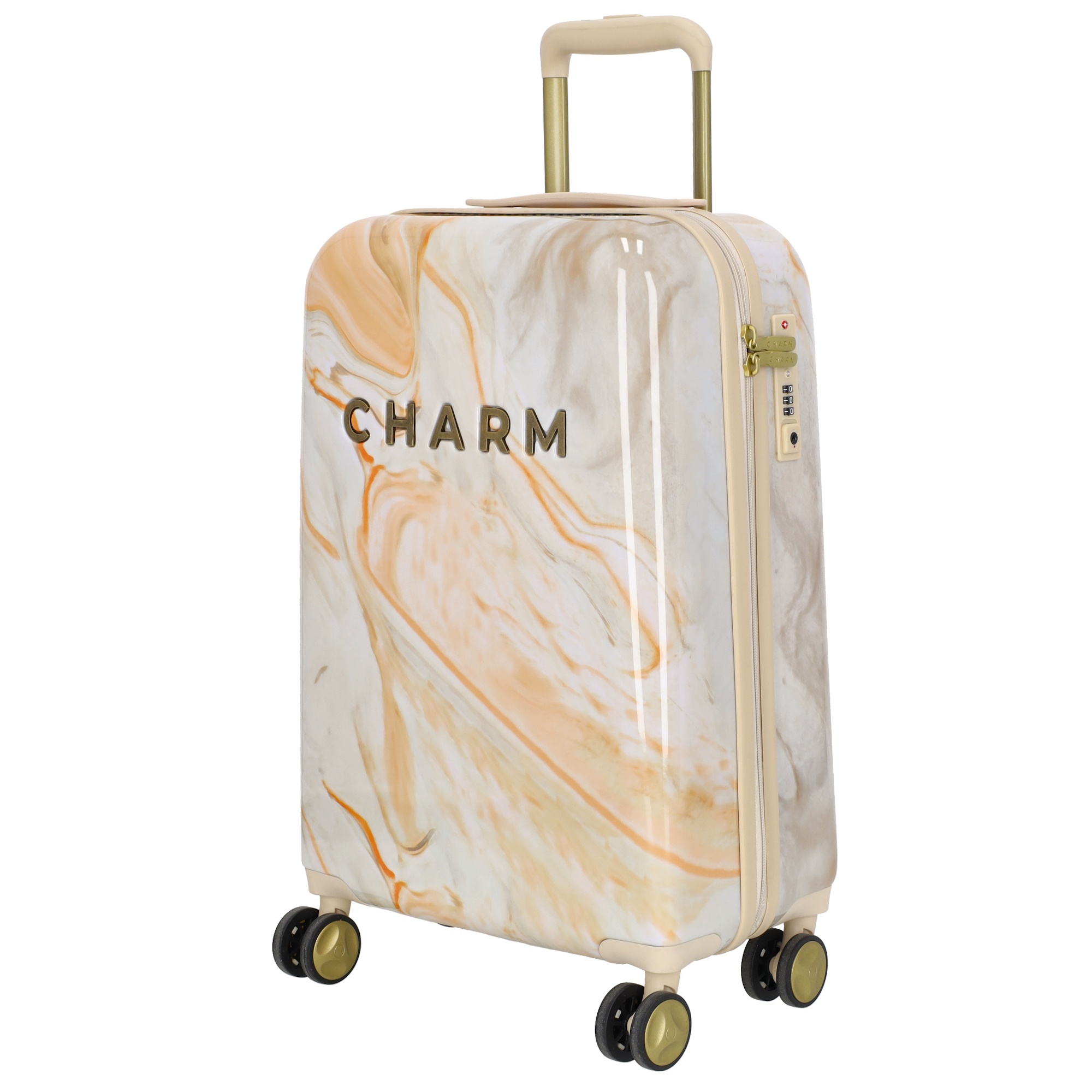 De Charm London Travel Koffer - 138 Crème marmeren cabineformaat heeft een stijlvol en uniek ontwerp, gemaakt van hoogwaardig materiaal. Het heeft handige kenmerken zoals een telescopische handgreep, vier dubbele spinnerwielen en een geïntegreerd TSA-slot. De beste manier om het te dragen is met de uittrekbare handgreep en de soepele wielen voor gemakkelijk manoeuvreren. Maak een fashion statement met deze elegante koffer tijdens al je reizen.