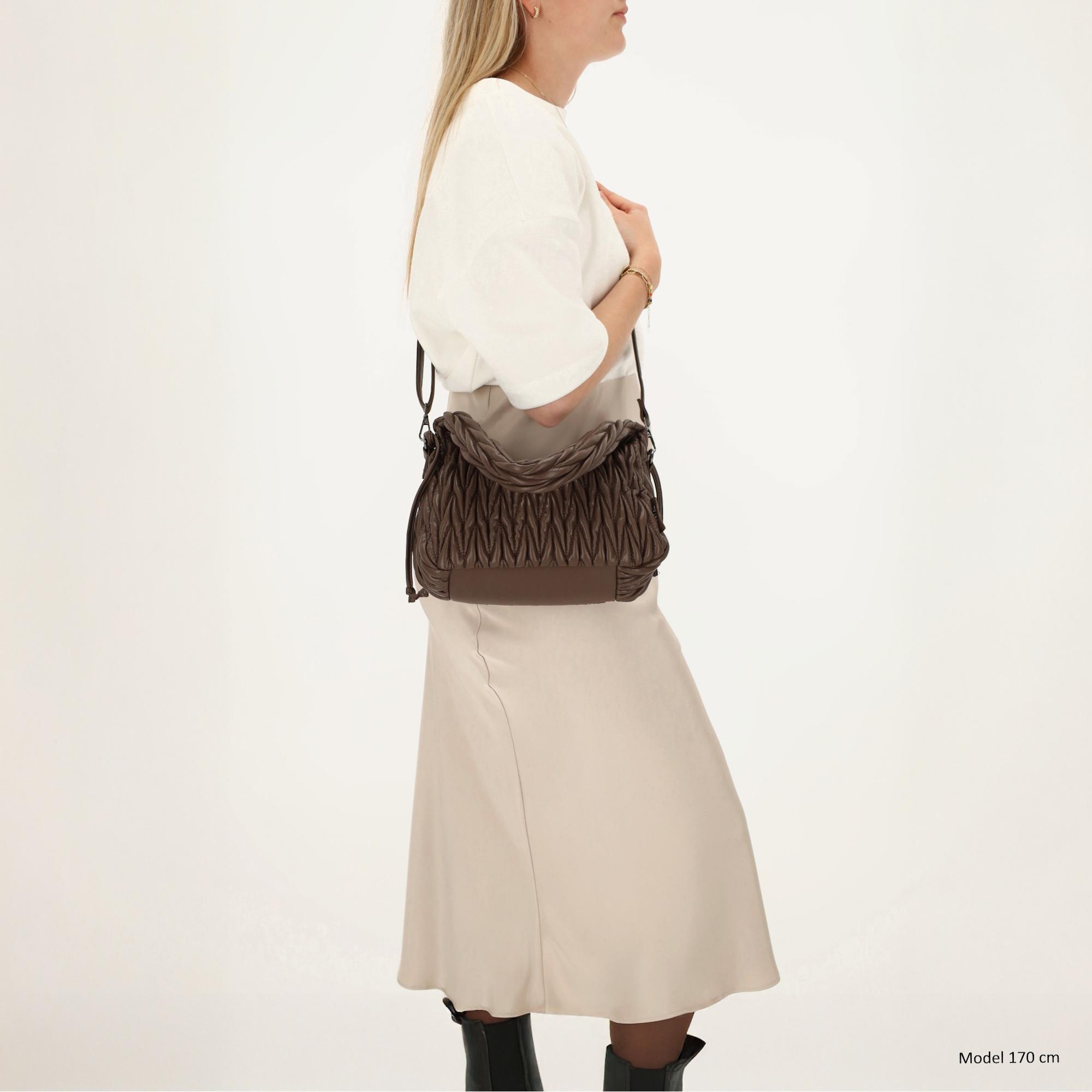 Binnenin vind je een ritsvak en een apart vakje voor je telefoon, zodat je je spullen netjes kunt opbergen. Het handvat kun je met de touwtjes aantrekken, waardoor het korter wordt en de tas een speels en modieus effect krijgt. Daarnaast wordt de tas geleverd met een lange, verstelbare en afneembare schouderband, zodat je hem ook comfortabel crossbody kunt dragen.