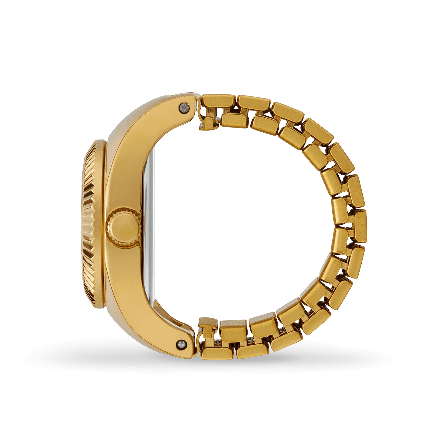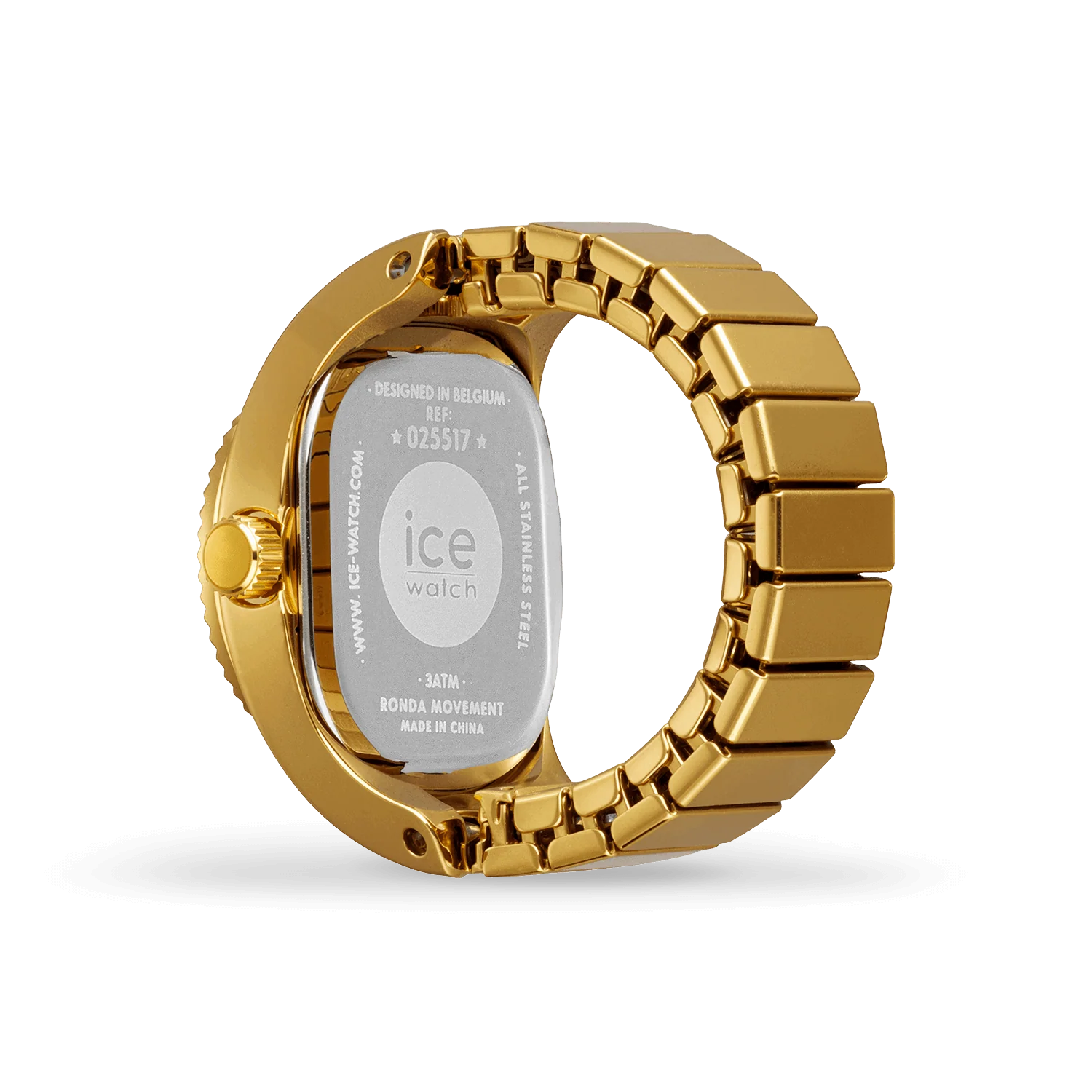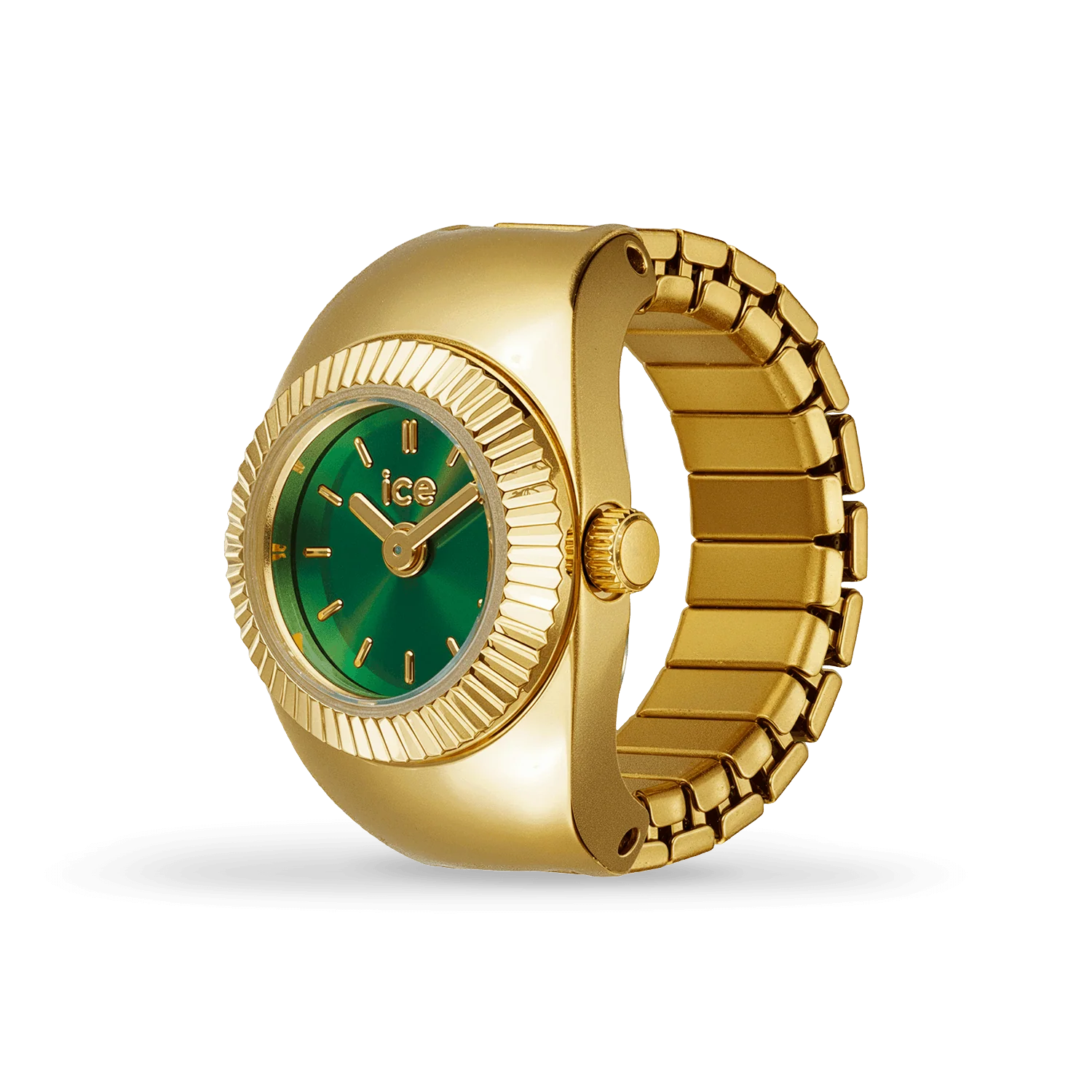 De Ice Ring Horloge Chouchou Gold olive 15mm, modelnummer 025517, heeft een goudkleurige roestvrijstalen kast en band, groene analoge wijzerplaat met streepindexen en mineraalglas. Het is waterbestendig tot niveau 3, heeft een datumfunctie, en werkt op een quartz-uurwerk. Draag het als een opvallend sieraad om uw vinger voor een unieke stijl.
