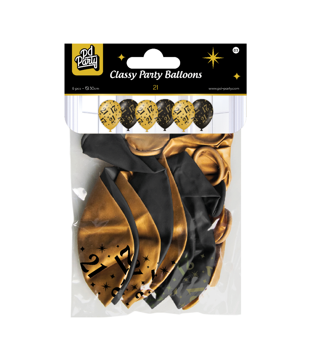 De gold/black Classy party balloons van Paper Dreams zijn een feestelijke toevoeging voor elke winkel. Deze goud/zwarte ballon met 21 is gemaakt van natuurlijk latex en door het unieke kleurgebruik zijn deze luxe ballonnen een echte eyecatcher. De Classy party balloons zijn 30 bij 30 centimeter en ze zijn te bestellen per 6.
