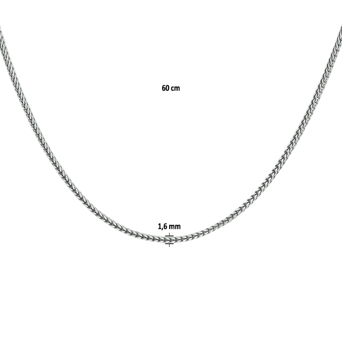 Deze zilveren ketting, modelnummer 1101662, is gemaakt van 925 sterling zilver, is nikkelvrij, heeft een breedte van 1,6 mm en is 60 cm lang. De ketting heeft een glanzende afwerking, wat het een elegante uitstraling geeft. Perfect te dragen met een hanger of stijlvol op zichzelf voor zowel dagelijkse als formele gelegenheden. Gewicht: 10,1 gram.