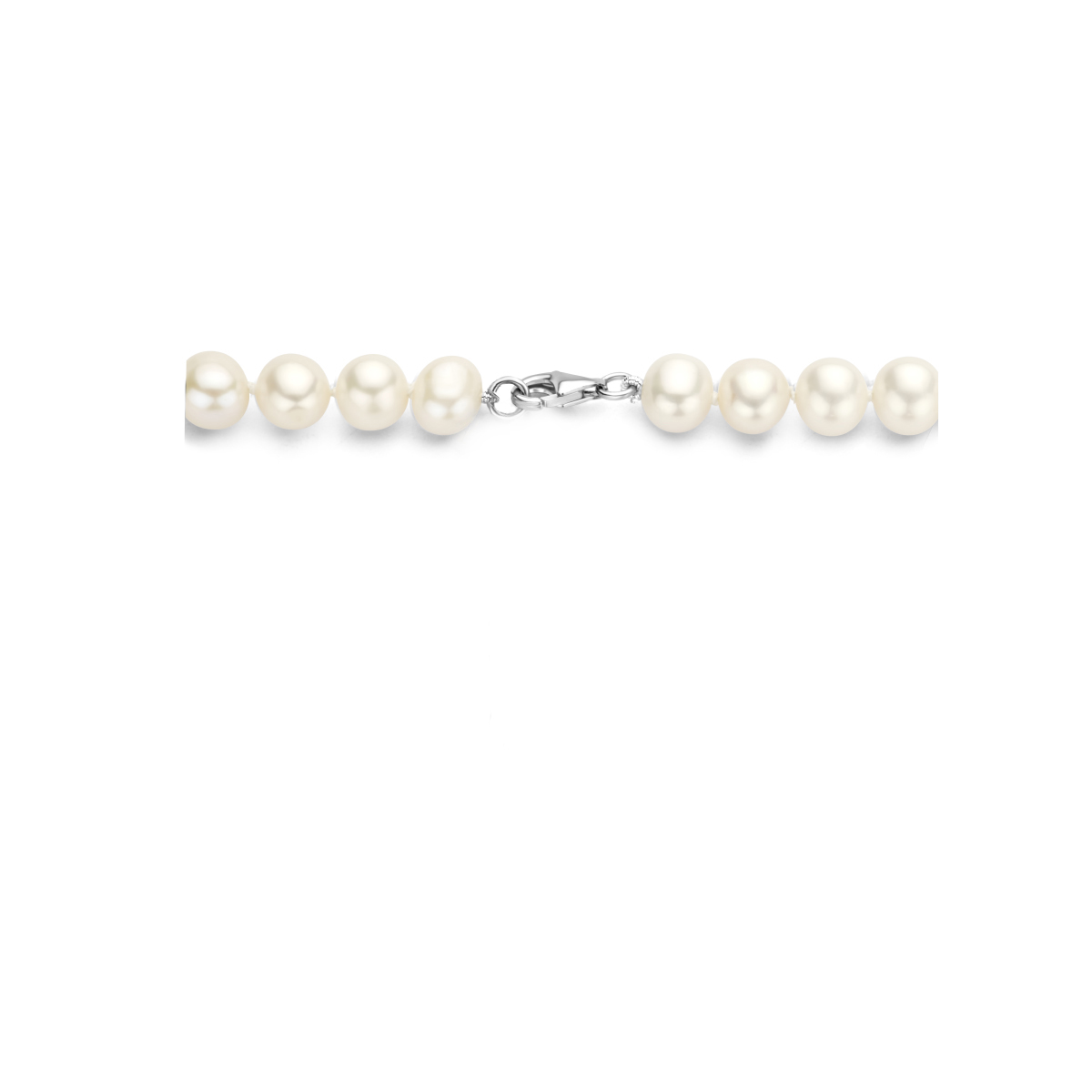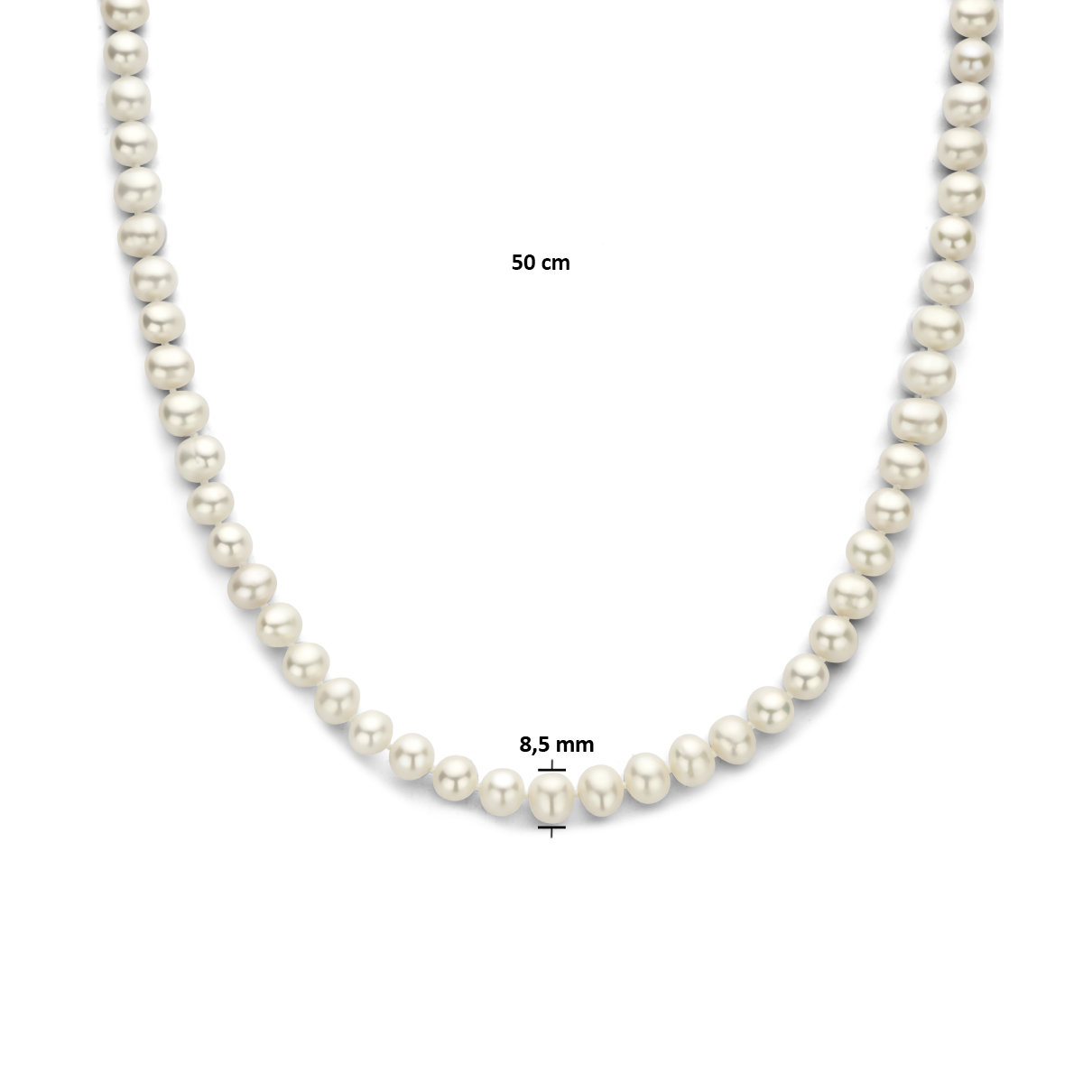 Gerhodineerd 925 zilveren collier uitgevoerd met zoetwaterparels van 8.5mm en een karabijn sluiting.