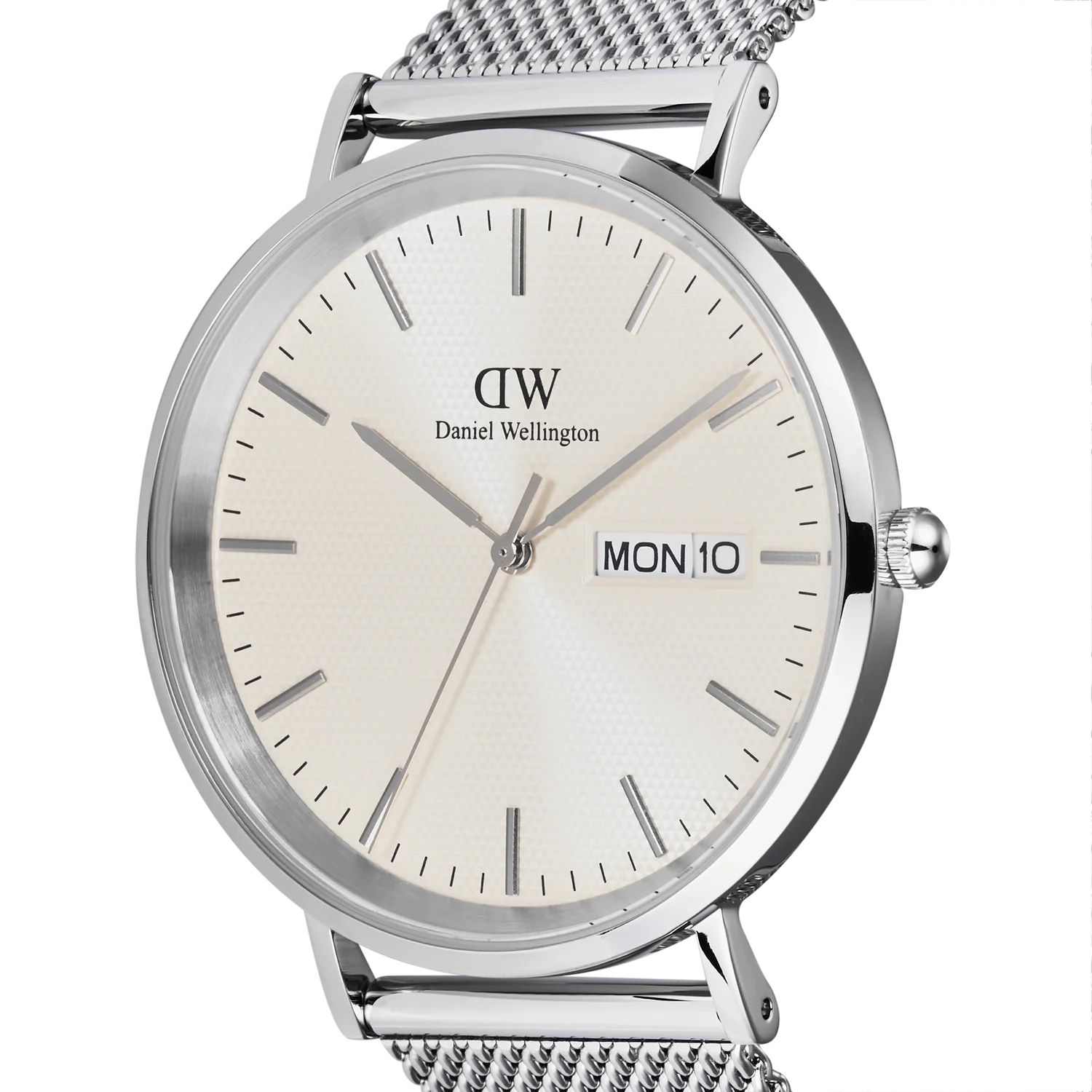De Daniel Wellington Horloge Classic Day Date (modelnummer: DW00100828) heeft een elegante zilverkleurige Milanese mesh band en een crèmekleurige wijzerplaat. Gemaakt van nikkelvrij roestvrij staal, is hij waterbestendig tot 3 ATM. De horlogekast is 40mm breed en 8mm dik. Het analoge uurwerk met datumaanduiding maakt het ideaal voor zowel formele als alledaagse gelegenheden.