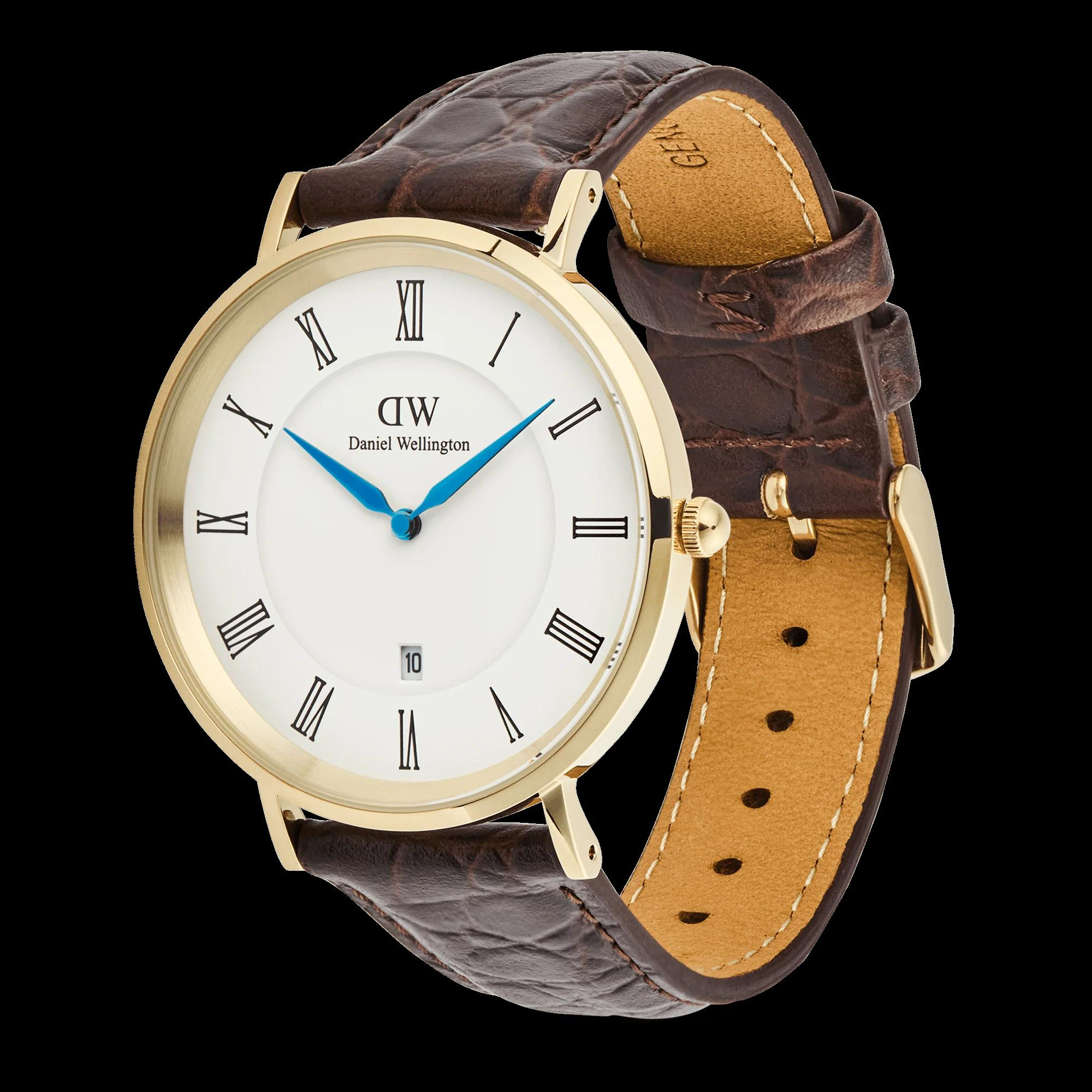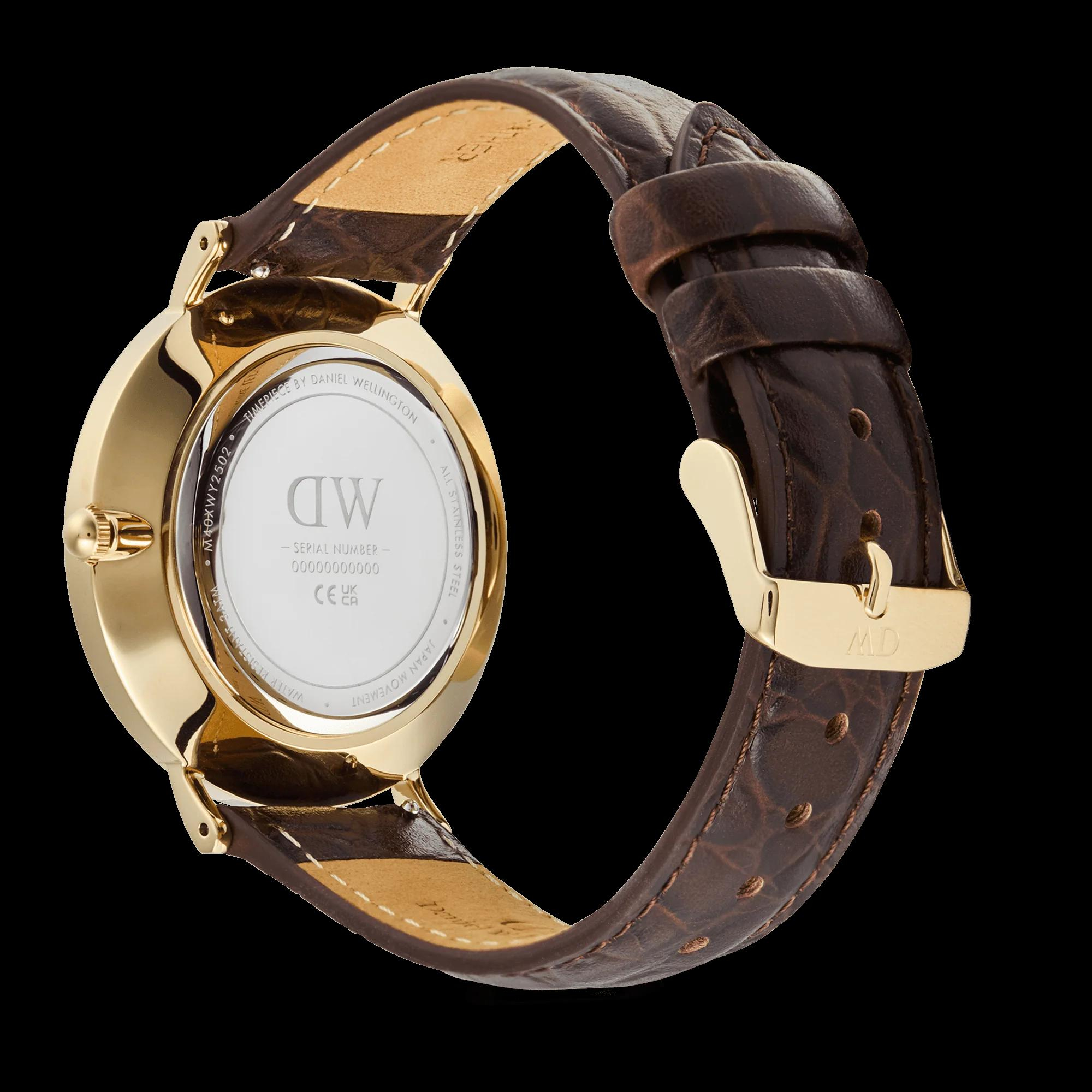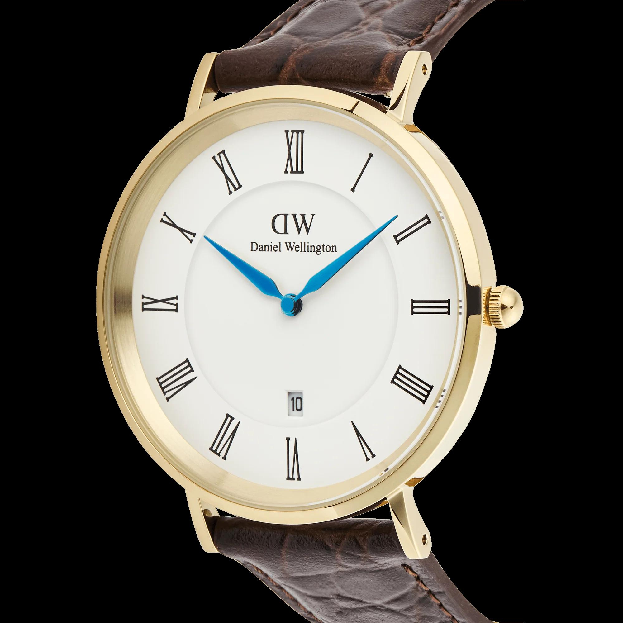 De Daniel Wellington Horloge Classic RN Date Croco Bruin Goud (modelnummer DW00100912) beschikt over een gouden roestvrijstalen kast, witte wijzerplaat met Romeinse cijfers, en een bruine lederen band. Hij is analoog met een datumfunctie en mineraalglas. Het beste te dragen bij zowel formele als casual outfits voor een stijlvolle uitstraling. Waterbestendigheid van niveau 3.