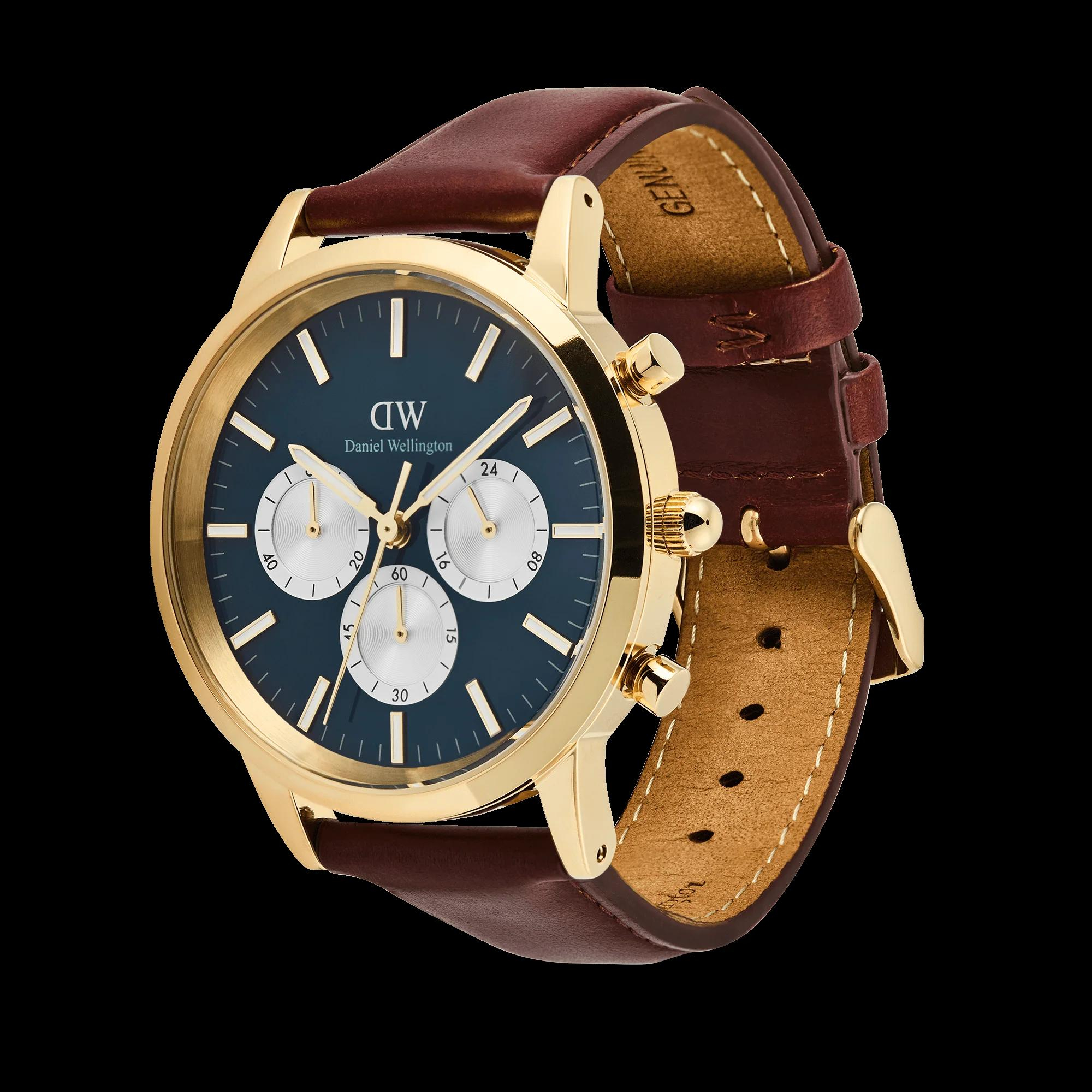 De Daniel Wellington Horloge Iconic Chronograph St Mawes Arctic Panda Gold, modelnummer DW00100875, heeft een blauwe wijzerplaat, bruine leren band en een goudkleurige roestvrijstalen kast van 42 mm. Met zijn minimalistische analoge ontwerp en quartz uurwerk straalt het elegantie uit. Perfect voor zowel formele als casual gelegenheden, deze horloge complementeert elke stijl zonder datumfunctie of verlichting.