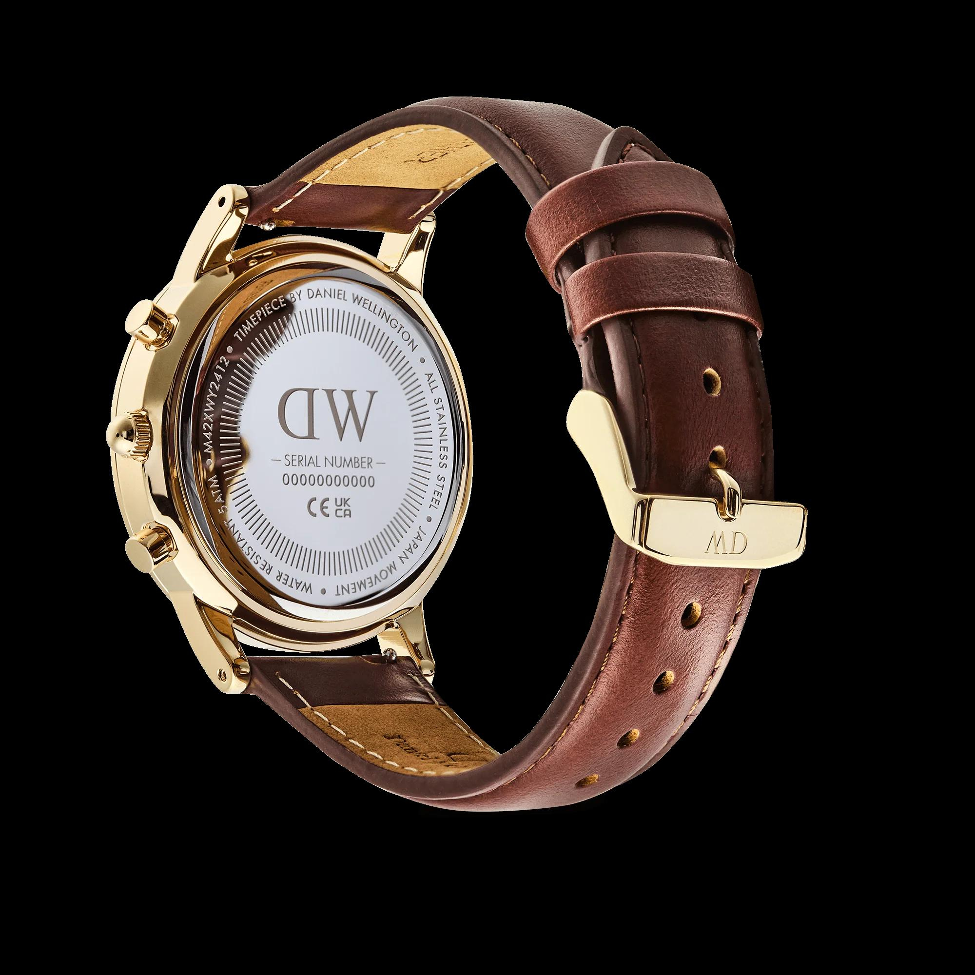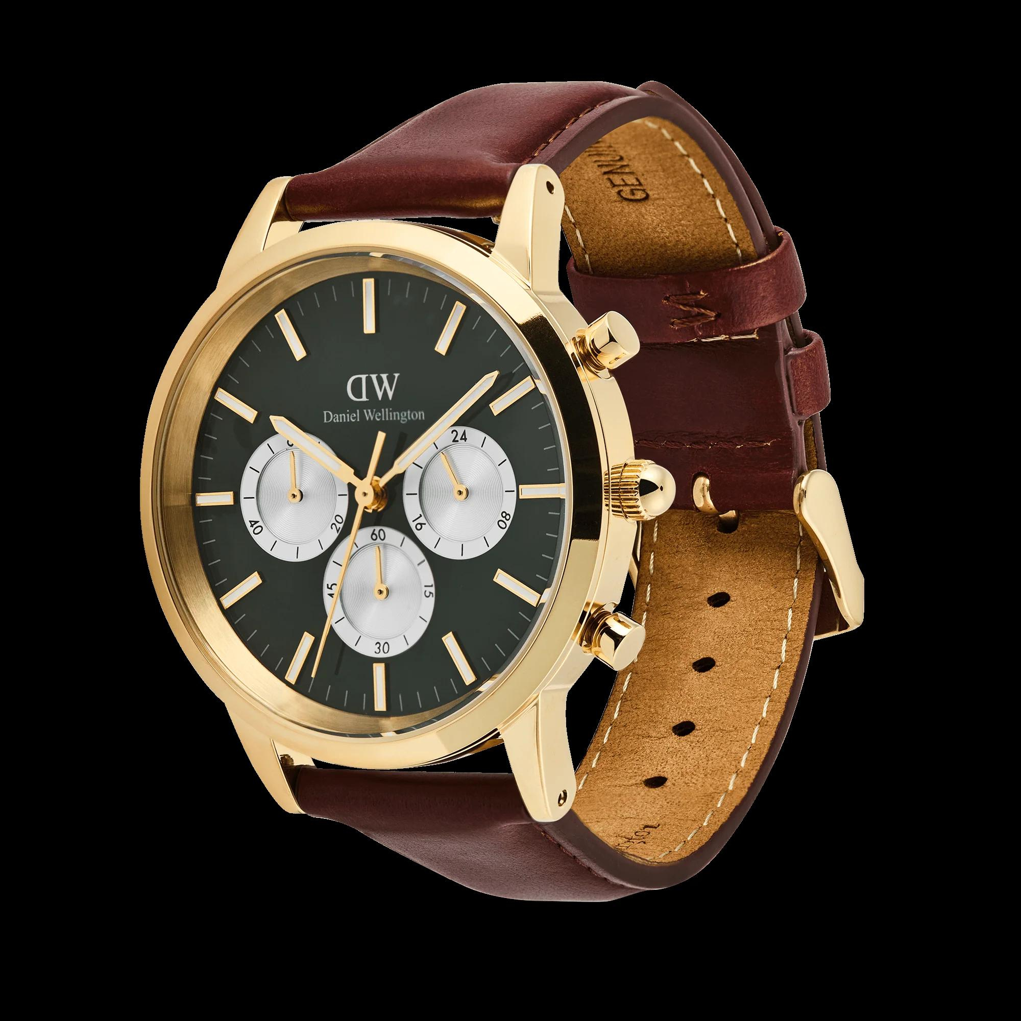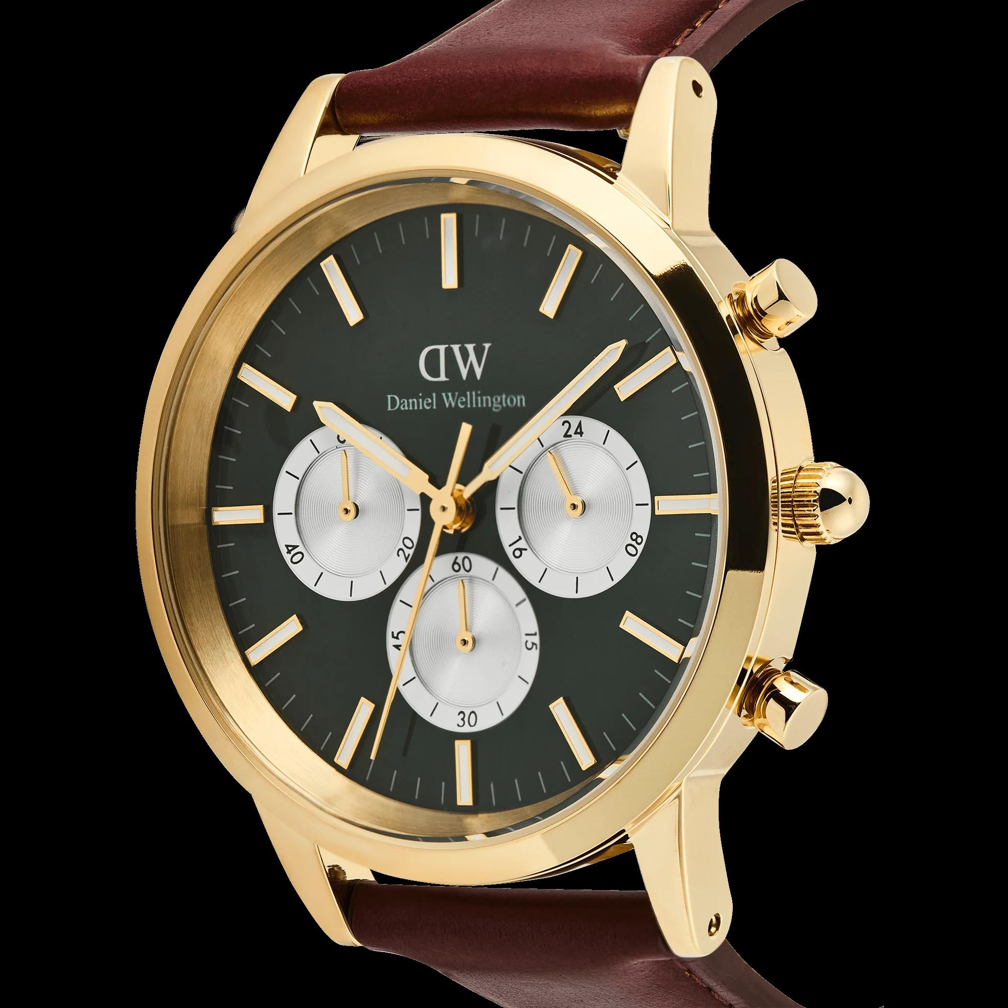 De Daniel Wellington Horloge Iconic Chronograph St Mawes Emerald Panda Gold (modelnummer DW00100876) heeft een groene wijzerplaat, een gouden roestvrijstalen kast, en een bruine echte leren band van 20mm. Met een grootte van 42mm, een dikte van 8mm, en waterbestendig tot 5 ATM, biedt het een quartz uurwerk zonder datumfunctie. Draag stijlvol bij formele en informele gelegenheden.