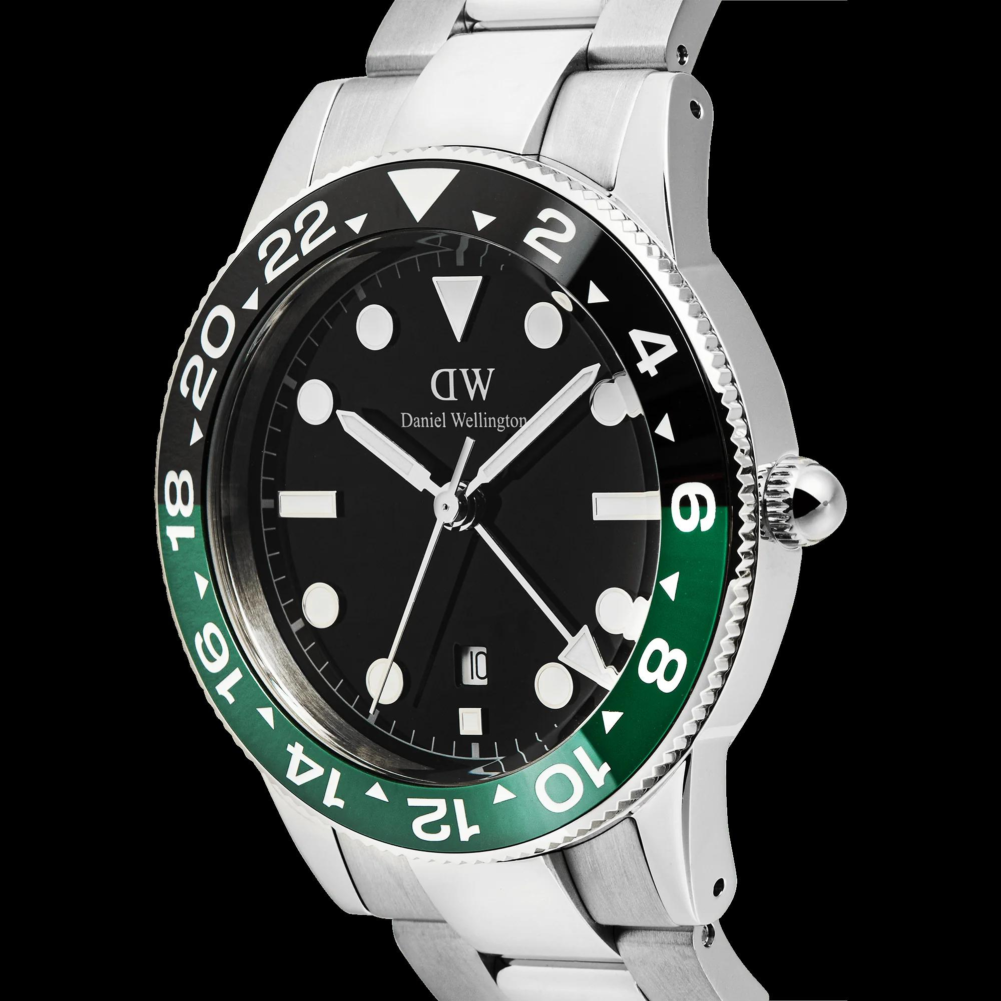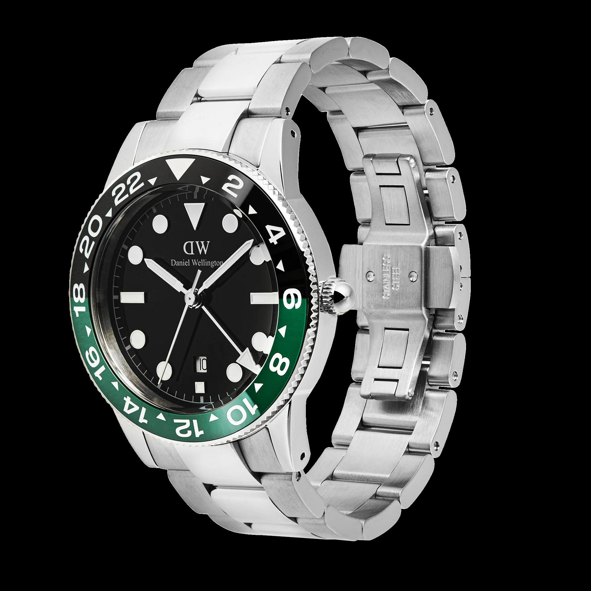 De Daniel Wellington Horloge Iconic GMT Link Black Green Ceramic Bezel Silver, model DW00100920, heeft een ronde, zilverkleurige roestvrijstalen kast, een zwarte wijzerplaat, en een zilverkleurige roestvrijstalen band. Het horloge is 40 mm groot, waterdicht tot 10 ATM, en heeft een kwartsuurwerk met datumaanduiding. Draag het bij zowel formele als casual gelegenheden voor een stijlvolle en verfijnde look.