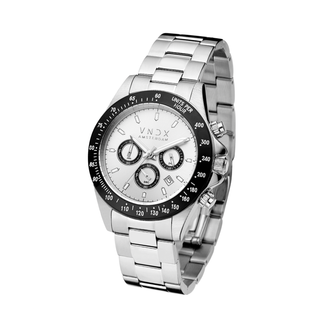 Stoer, mysterieus en sterk. Met deze Dark DJ Silver Edition heb je een stoer en modern massief stalen horloge om je pols. De kast en band zijn van staal, om de witte wijzerplaat met chronometers zit een stoere zwarte ring. Ben de DJ van je eigen leven, leef volgens je eigen regels. Never too late to start!