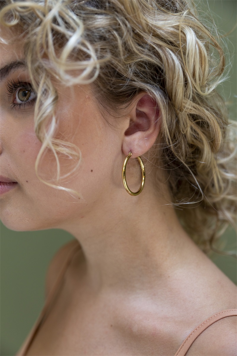 Deze prachtige oorringen van Day & Eve zijn gemaakt van roestvrij staal met een 14K vergulde coating. Ze hebben een afmeting van 30x3mm en zijn perfect voor dagelijks gebruik of voor een avondje uit. De oorringen hebben een subtiele glans en zijn licht van gewicht, waardoor ze comfortabel zijn om de hele dag te dragen. Combineer ze met je favoriete outfit voor een stijlvolle look.