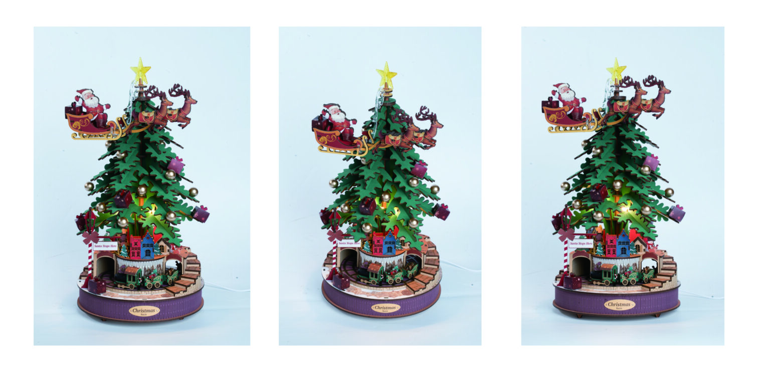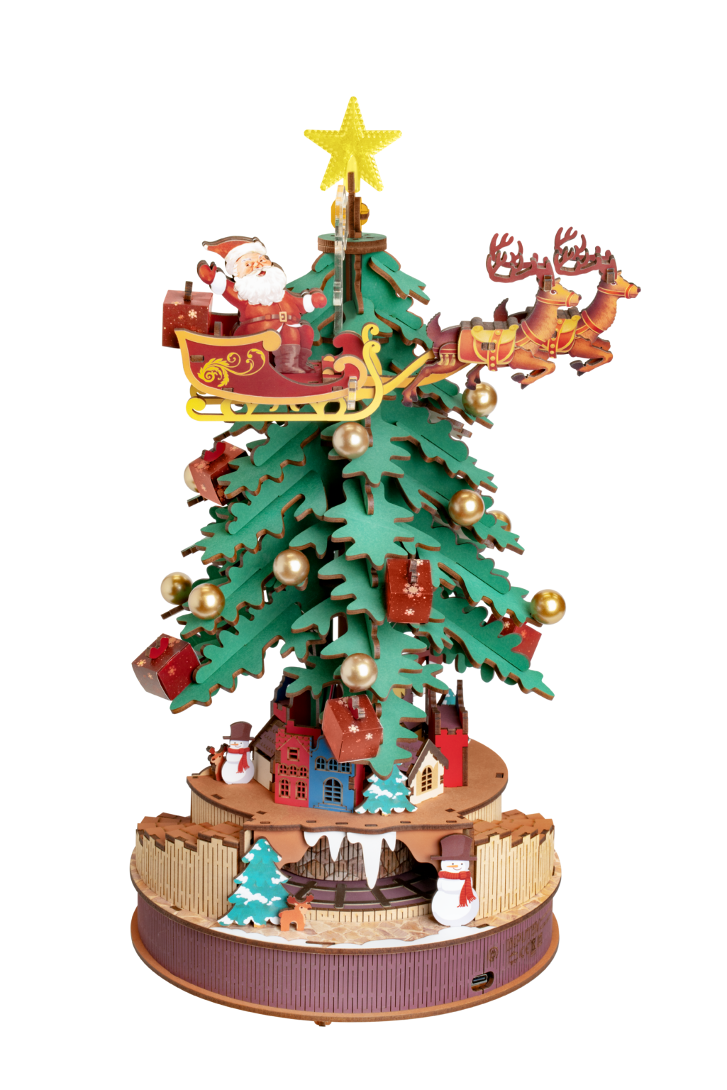 Deze prachtige Robotime muziekdoos in de vorm van een kerstboom, zorgt dat jij klaar bent voor de feestdagen! Haal de gezelligheid in huis met dit mooie bouwpakket waar een muziekdoosje in zit! De schitterende gekleurde details zorgen dat iedereen zijn ogen hierop gericht heeft: de kerstboom hangt vol met cadeautjes en gouden ballen. Bovenin zie je de kerstman met zijn rendieren en onder de kerstboom vind je schattige huisjes, een rijdende trein en andere leuke items.