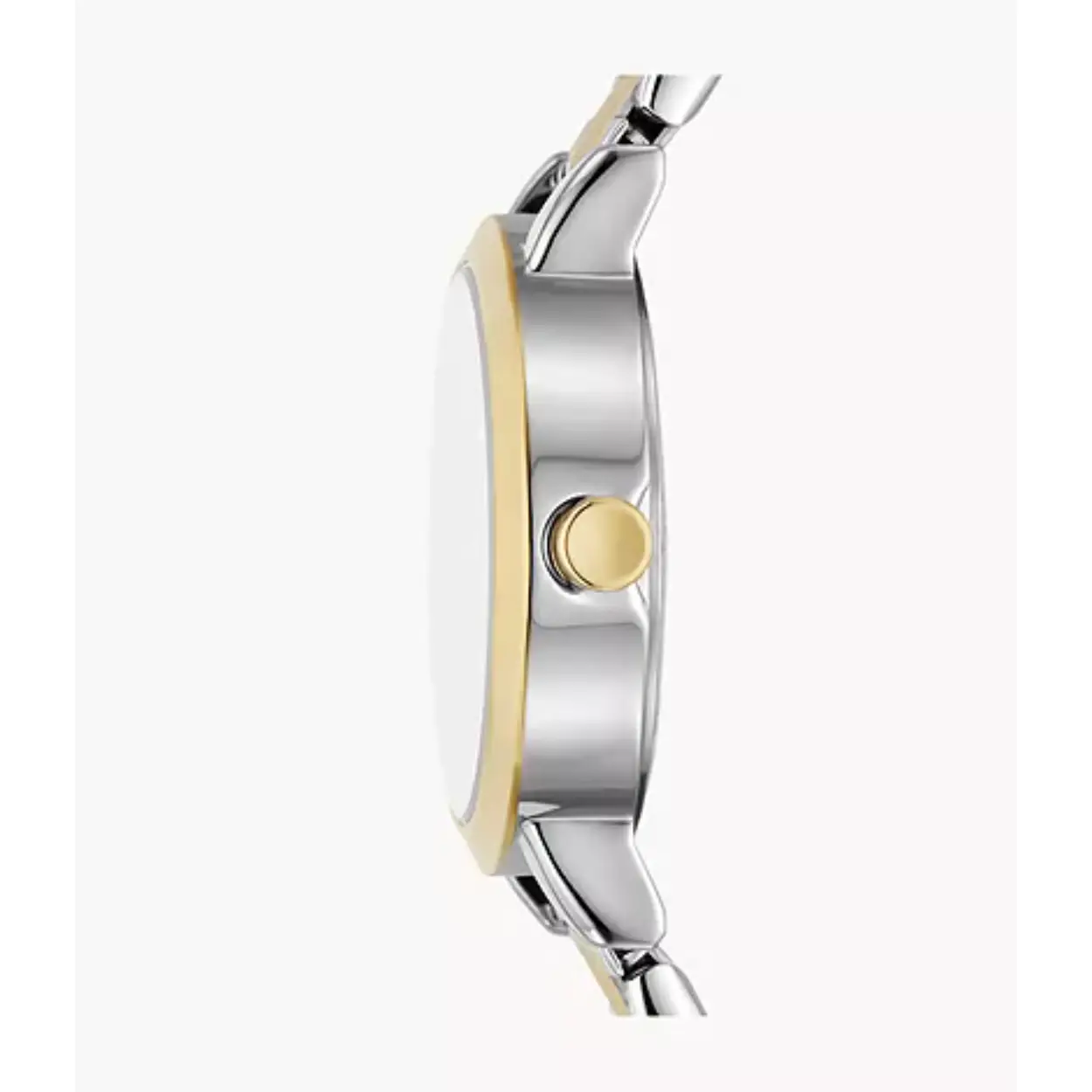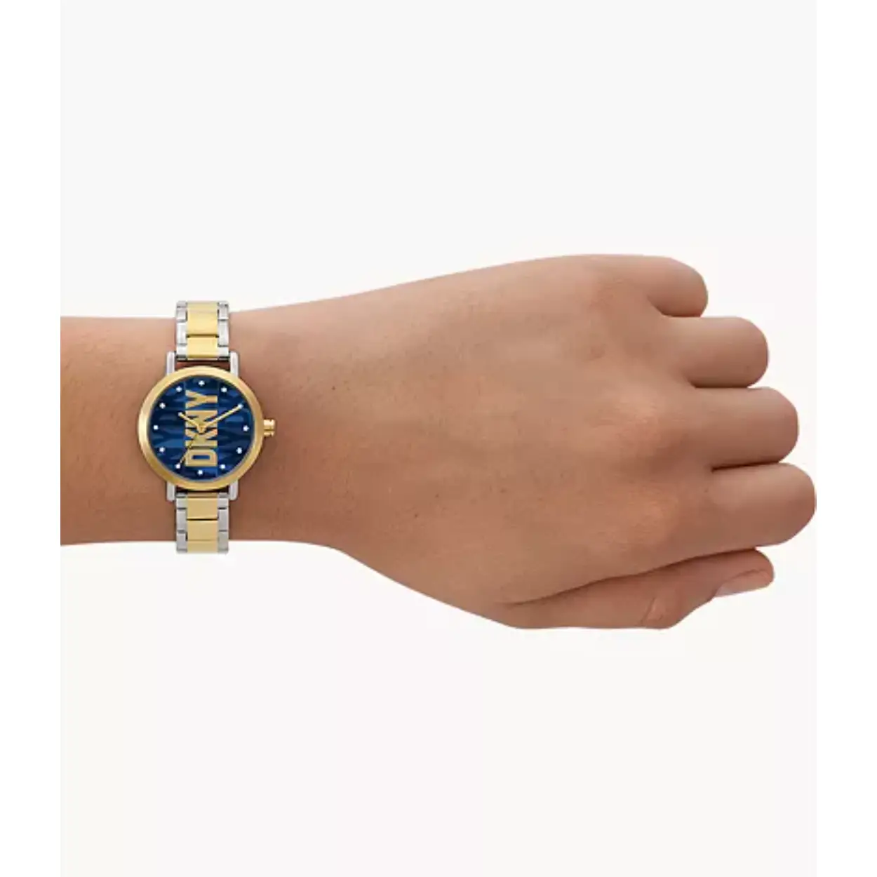 Dit DKNY horloge, uit de Soho collectie, heeft een bicolor stalen band en kast. De wijzerplaat is donkerblauw met het bekende DKNY logo bedrukt in goudkleur.