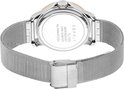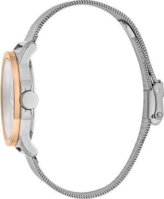 Dit multifunctie dameshorloge uit de Turn serie van Esprit heeft mineraalglas, een zilverkleurige wijzerplaat met en een bicolor rosékleurige stalen horlogekast met een kastdiameter van 36 mm. De zilverkleurige band van het horloge is van Milanees gevlochten staal en is gemakkelijk op maat te maken d.m.v een schroevendraaier. Duw het klepje omhoog en plaats de sluiting op de juiste positie. Na het dichtduwen van het klepje is het horloge opnieuw klaar voor gebruik! U kunt dit zo vaak doen als nodig.
