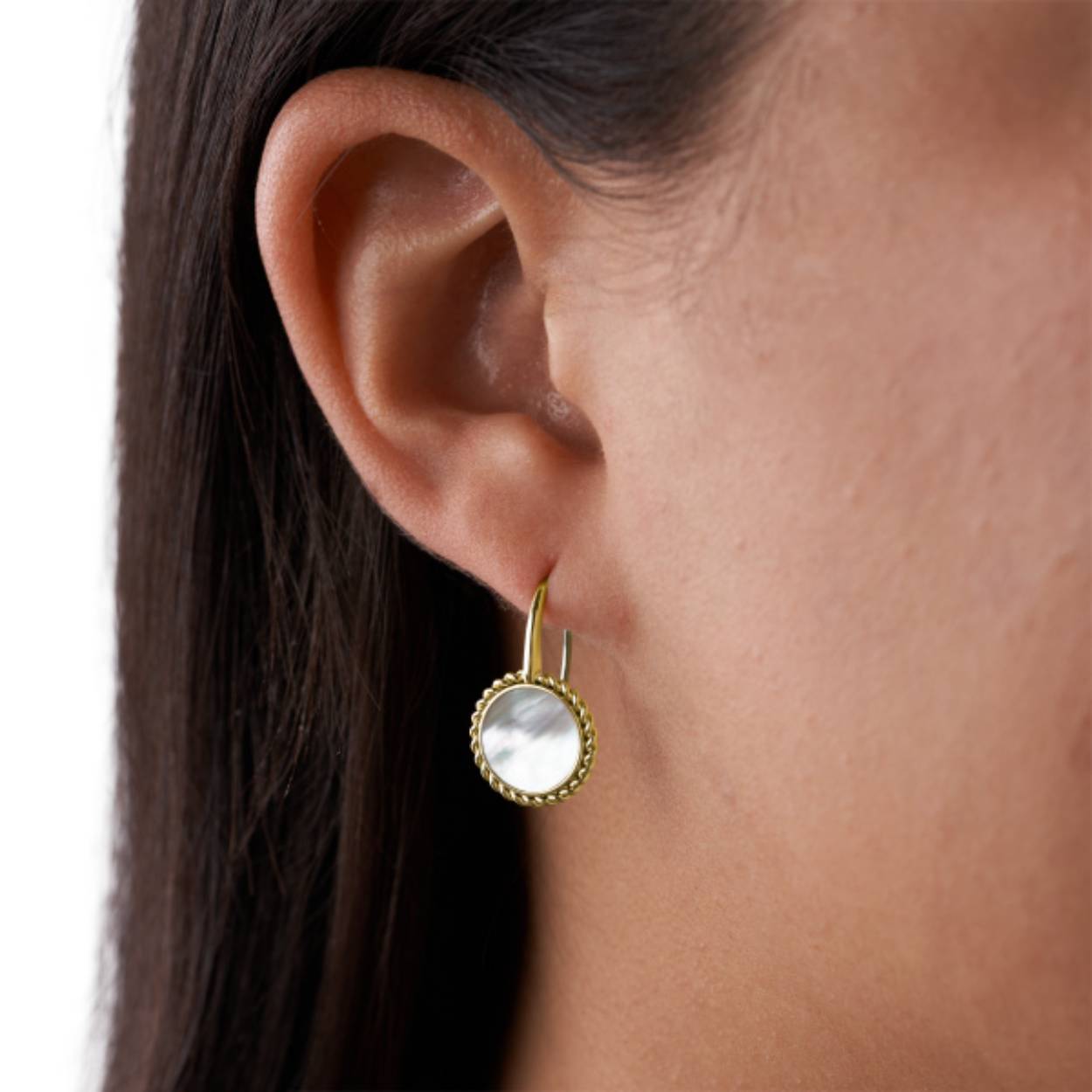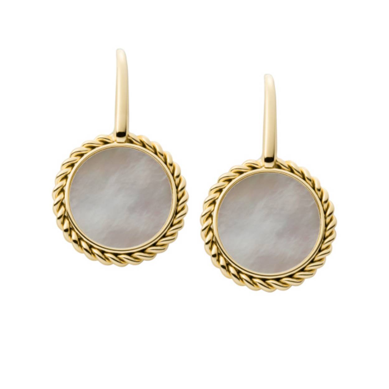 Fossil oorhangers goudkleurig rond met parelmoer middensteen. De oorhangers komen uit de Fossil collectie Vintage Iconic.
