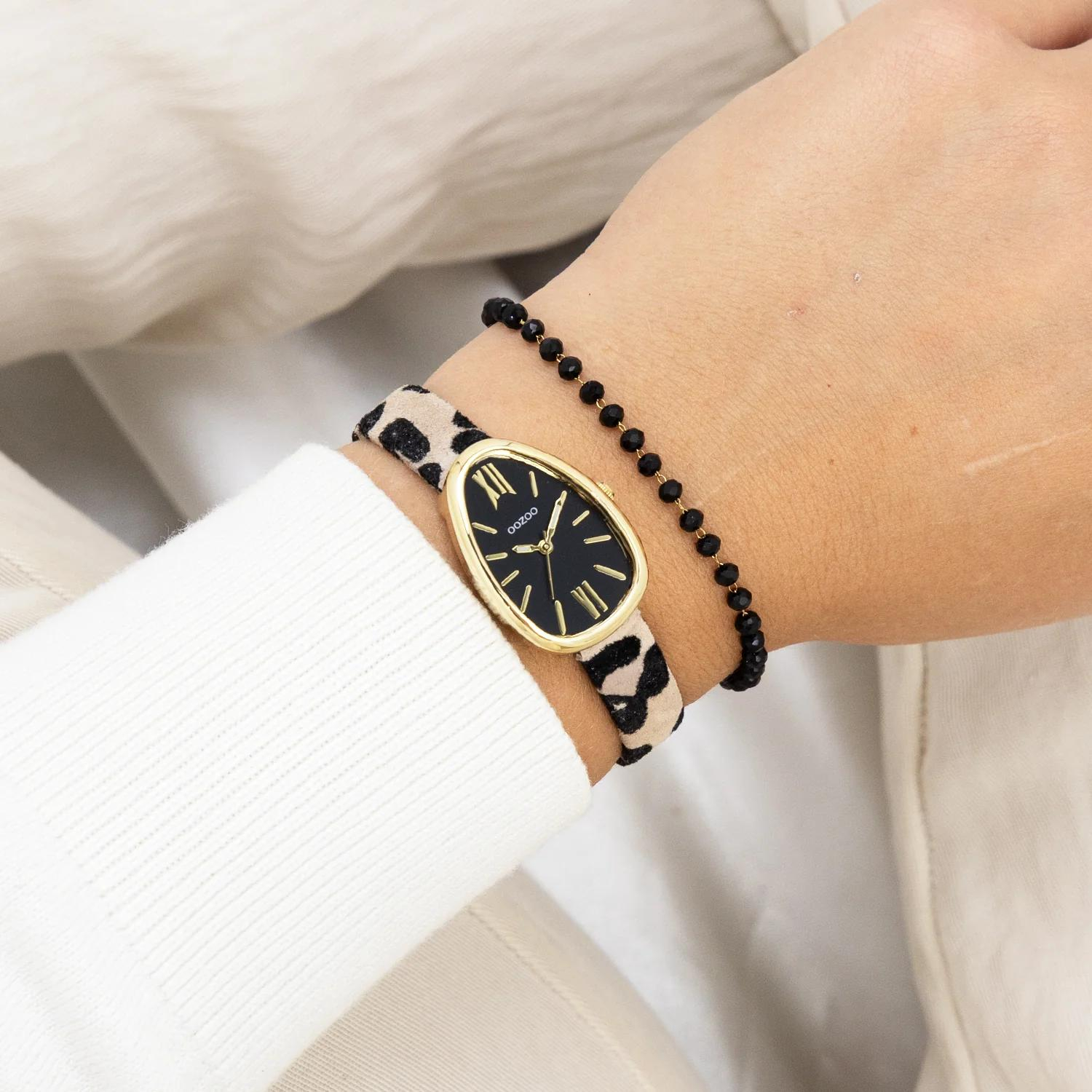 Val op met dit prachtige eivormige dameshorloge uit de trendy OOZOO Timepieces-collectie. De C11639 heeft een bruin/zwarte leren band met luipaardprint en een 31x22 mm goudkleurige metalen horlogekast. Je maakt een echt fashion statement met deze zwarte wijzerplaat, goudkleurige strepen, Romeinse cijfers en bijpassende wijzers. Dit onmisbare horloge voor je garderobe heeft mineraalglas, een roestvrijstalen achterplaat en is nikkelbestendig. Dit horloge heeft een 2ATM Japans uurwerk en wordt geleverd met 2 jaar garantie