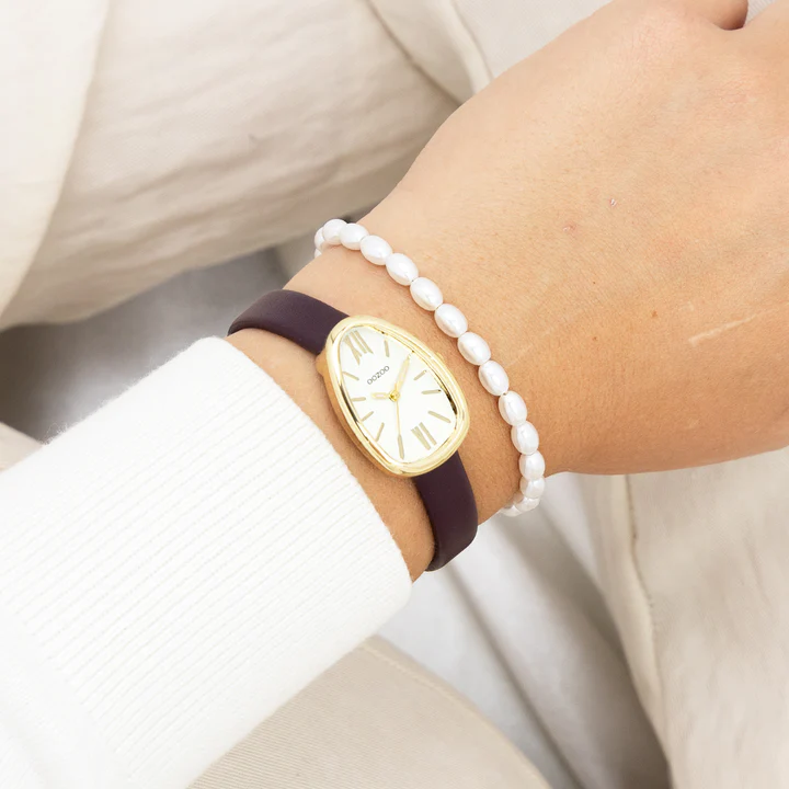 Val op met dit prachtige eivormige dameshorloge uit de trendy OOZOO Timepieces-collectie. De C11635 heeft een vijgenrode leren band en een 31x22 mm goudkleurige metalen horlogekast. Maak een echt fashion statement met deze witte wijzerplaat, goudkleurige strepen, Romeinse cijfers en bijpassende wijzers. Dit onmisbare horloge voor je garderobe heeft mineraalglas, een roestvrijstalen achterplaat en is nikkelbestendig. Dit horloge heeft een 2ATM Japans uurwerk en wordt geleverd met 2 jaar garantie