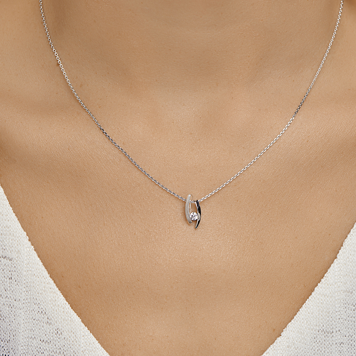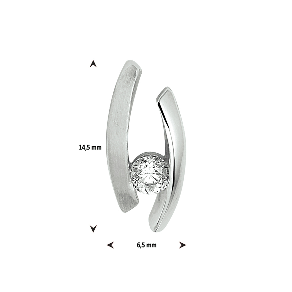 Beschrijving: Gerhodineerd zilveren hanger uitgevoerd met een heldere zirkonia en een poli/matte afwerking. De hanger heeft afmeting van 14.5x6.5mm.
