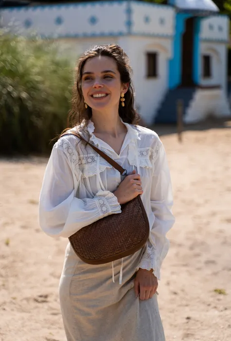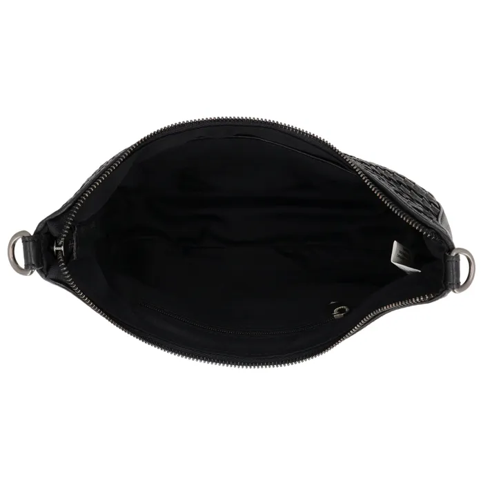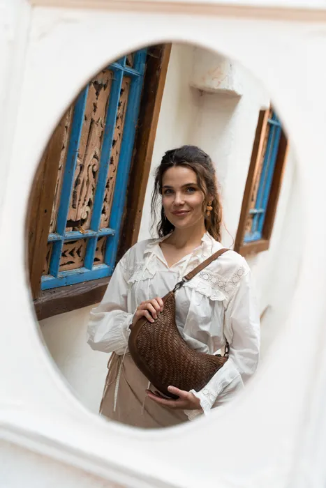 • Leren schoudertas met handgeweven voorkant