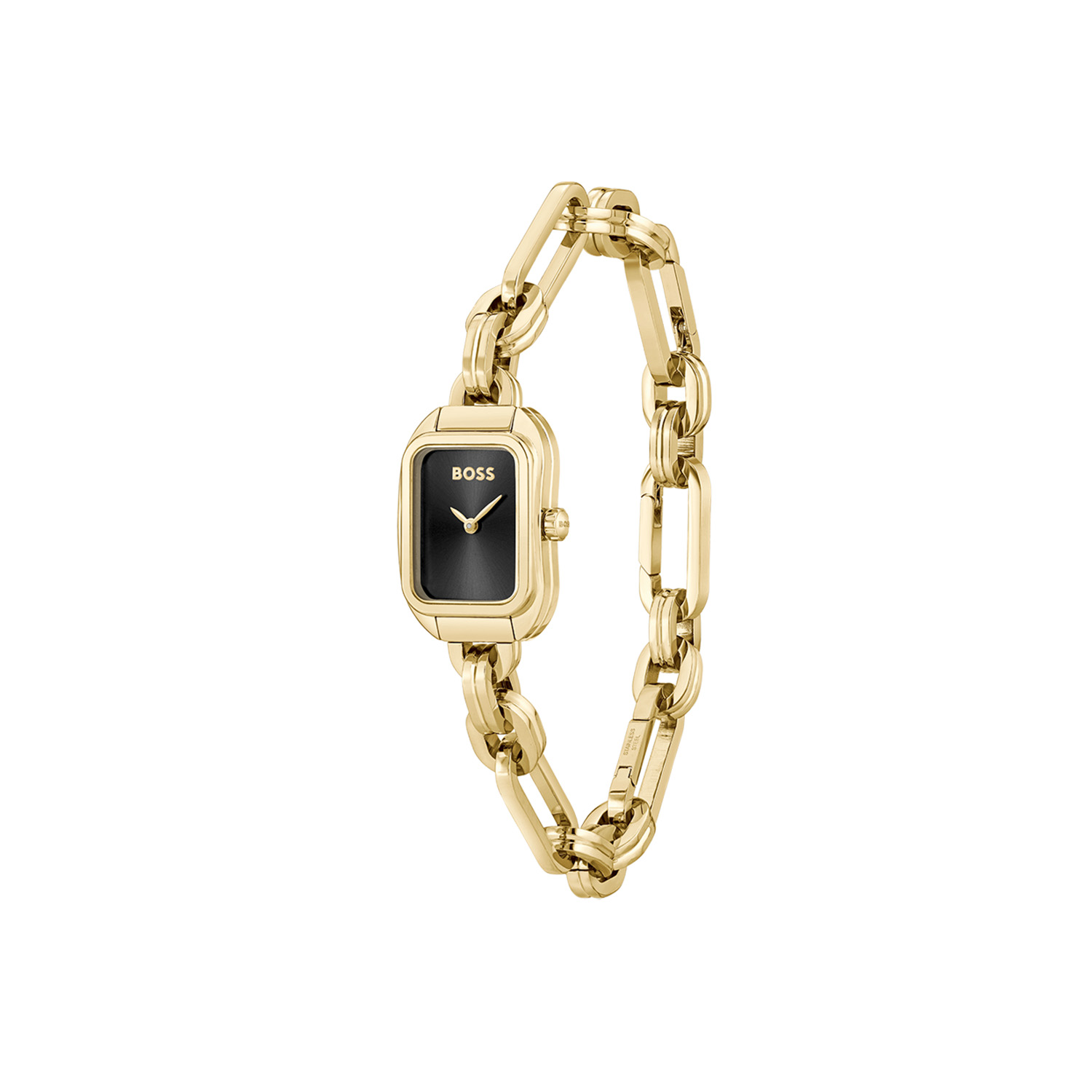 Dit BOSS horloge uit de HAILY-LE serie met artikelnr: HB1502739 heeft een chique look. Zeer geschikt voor de moderne stijlvolle vrouw van nu. Het goudkleurige dameshorloge valt op door zijn stalen rechthoekige horlogekast met een zwarte wijzerplaat met minimalistische wijzers. Aan de kast zit een goudkleurige schakelband met karabijnsluiting. De kast van het horloge heeft een afmeting van 19x28mm met mineraalglas en is 3ATM.