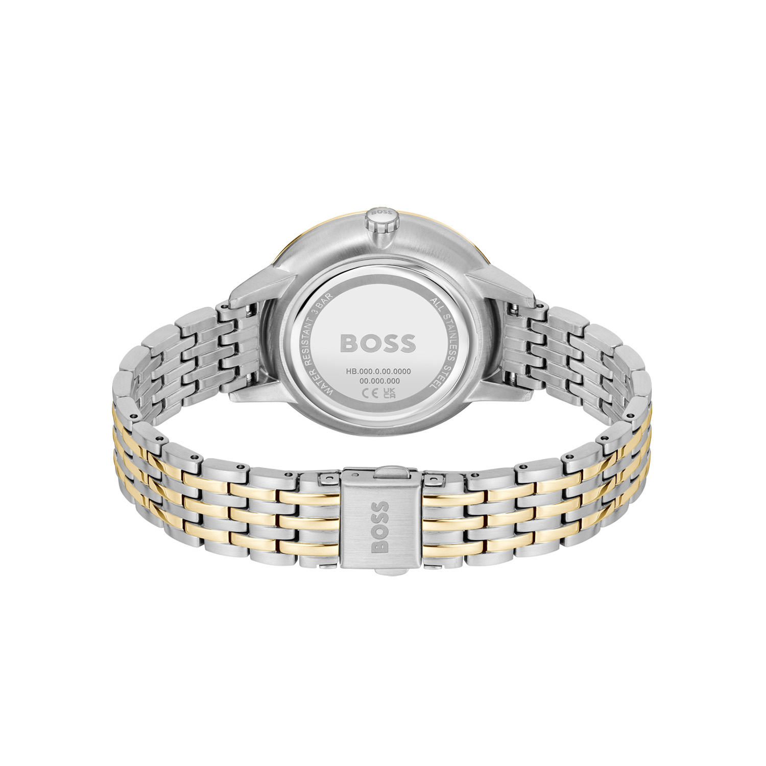 Dit BOSS horloge uit de SYMPHONY serie met artikelnr: HB1502783 heeft een elegante uitstraling. Zeer geschikt voor de moderne stijlvolle vrouw van nu. Het dameshorloge valt op door zijn stalen horlogekast met een gladde goudkleurige bezel en een zwarte sunray wijzerplaat met een dag, datum en 24-uursaanduiding. Opvallend zijn de fijne wijzers, 4 kristallen op de 12 en het strakke BOSS logo. Aan de kast zit een mat glanzende zeer fijne bicolor stalen schakelband zit met een vouwsluiting. Het horloge heeft een doorsnee van 38mm met een mineraalglas en is 3ATM.