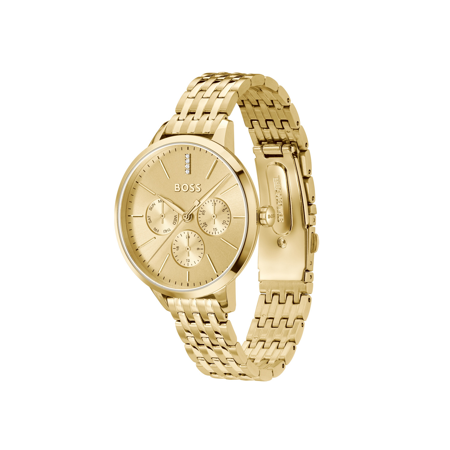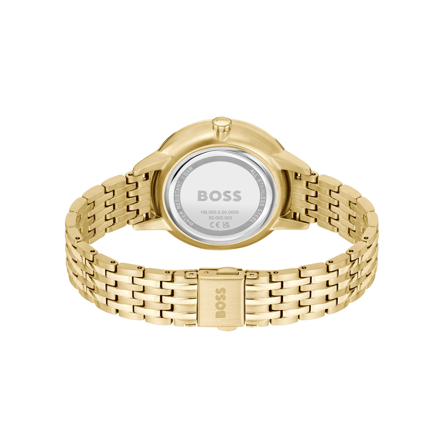 Dit BOSS horloge uit de SYMPHONY serie met artikelnr: HB1502782 heeft een elegante uitstraling. Zeer geschikt voor de moderne stijlvolle vrouw van nu. Het dameshorloge valt op door zijn goudkleurige stalen horlogekast met een gladde bezel en een goudkleurige sunray wijzerplaat met een dag, datum en 24-uursaanduiding. Opvallend zijn de fijne wijzers, 4 kristallen op de 12 en het strakke BOSS logo. Aan de kast zit een mat glanzende zeer fijne goudkleurige stalen schakelband zit met een vouwsluiting. Het horloge heeft een doorsnee van 38mm met een mineraalglas en is 3ATM.