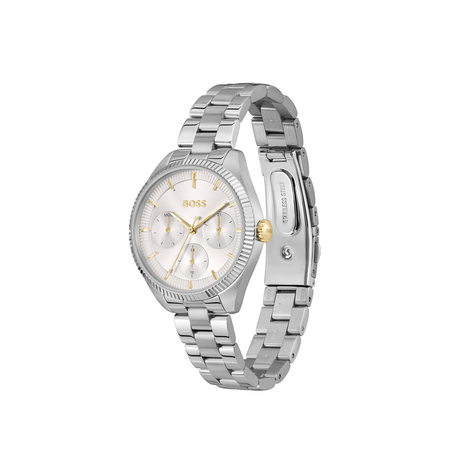 Dit BOSS horloge uit de SAGE SPORT serie met artikelnr: HB1502800 heeft een luxe uitstraling. Zeer geschikt voor de moderne stijlvolle vrouw van nu. Het dameshorloge valt op door zijn stalen horlogekast met een gekartelde bezel en een zilverwitte sunray wijzerplaat met een dag,- datum,- en 24-uursaanduiding. De wijzers en uurstrepen zijn fijn gefaceteerd. Aan de kast zit een stalen schakelband met een vouwsluiting. Het horloge heeft een doorsnee van 34mm een mineraalglas en is 3ATM.