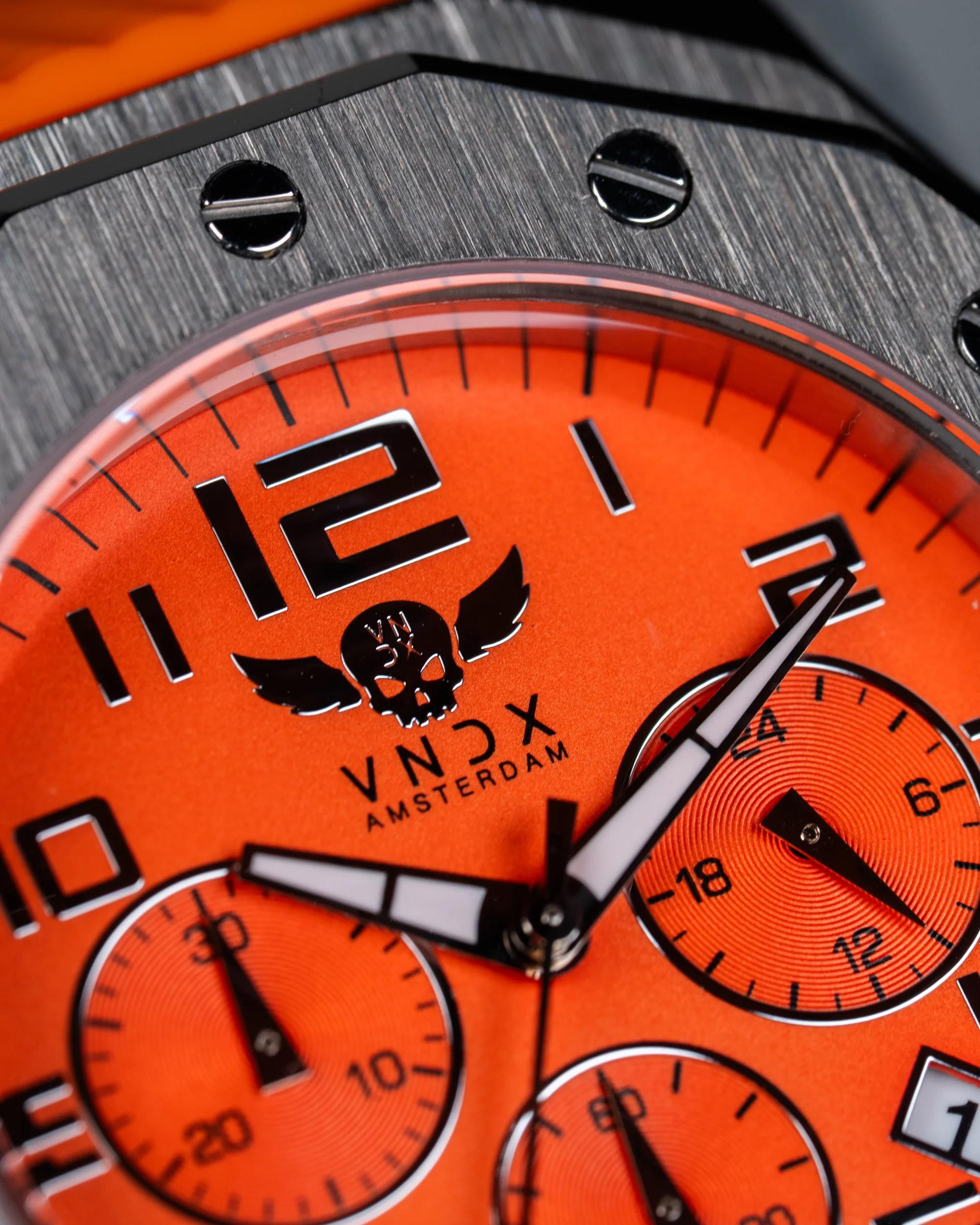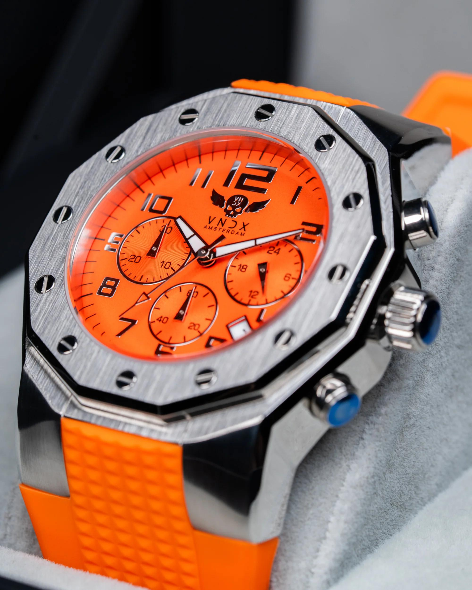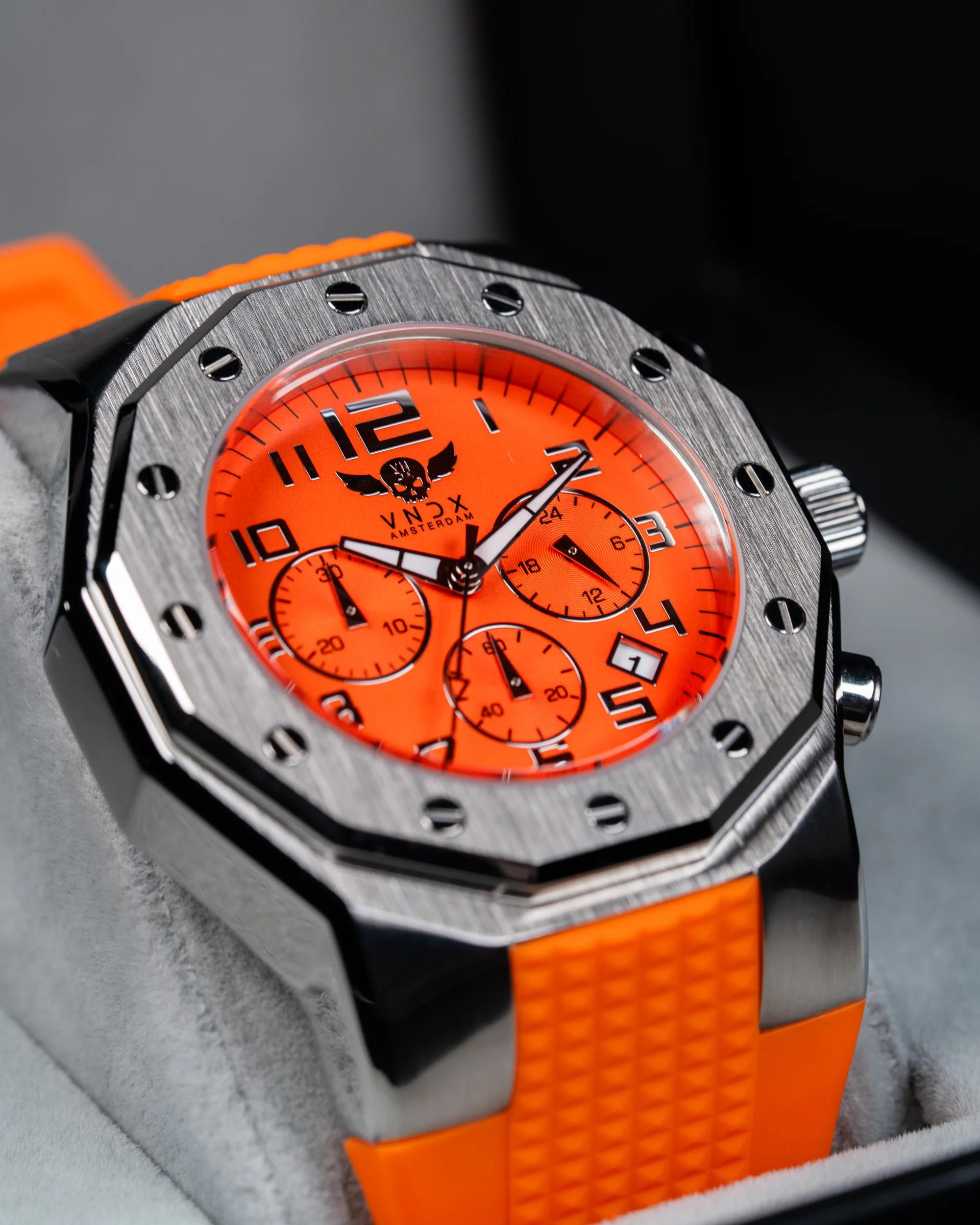 De Ibiza Rebel van VNDX Amsterdam is een krachtig uniseks polshorloge met een robuuste uitstraling en een kastdiameter van 46 mm. Dit statement piece is ontworpen voor wie geen concessies wil doen aan stijl of functionaliteit. Dankzij de chronograaf met stopwatch, datumaanduiding, en lichtgevende Luminor wijzers ben je altijd voorbereid – dag en nacht.