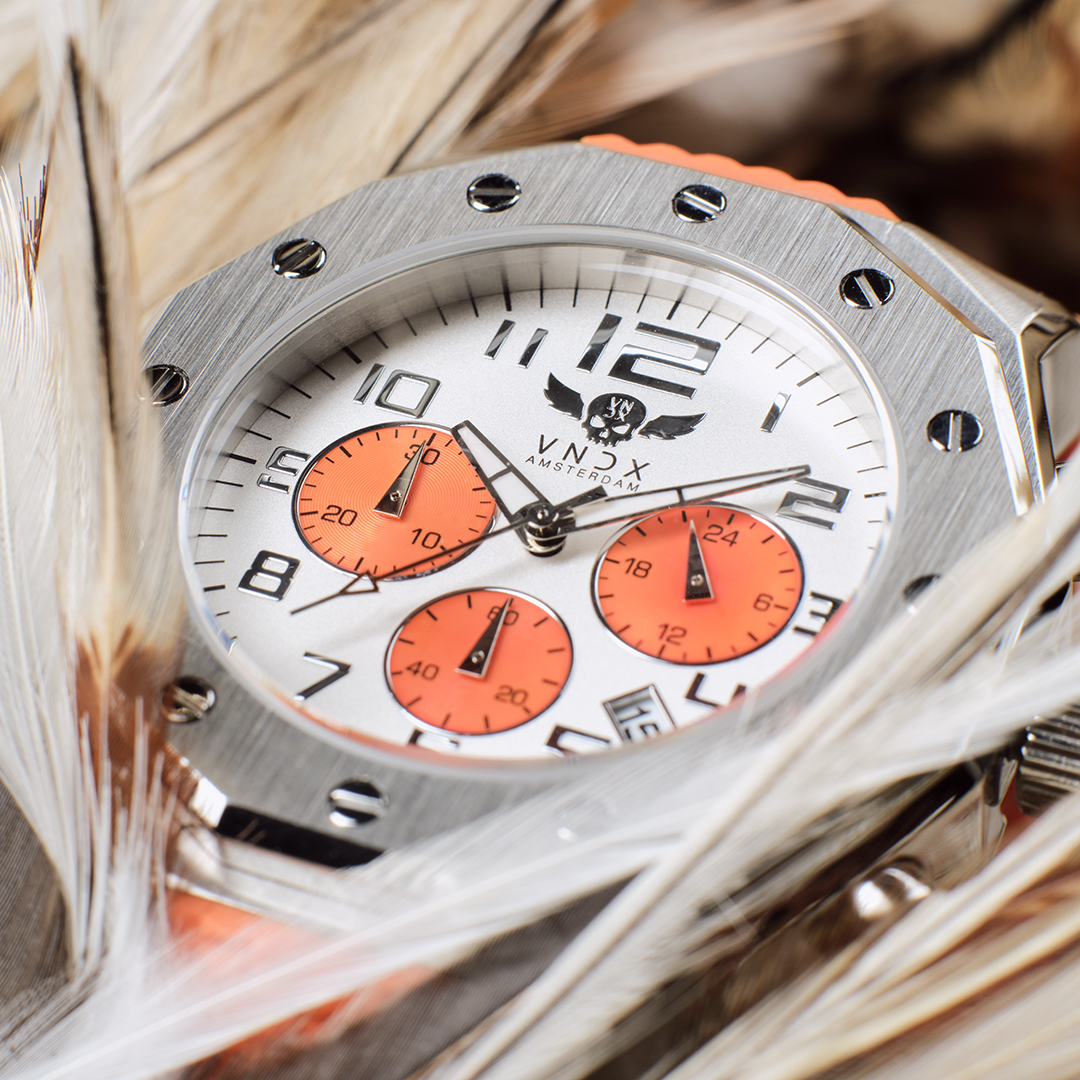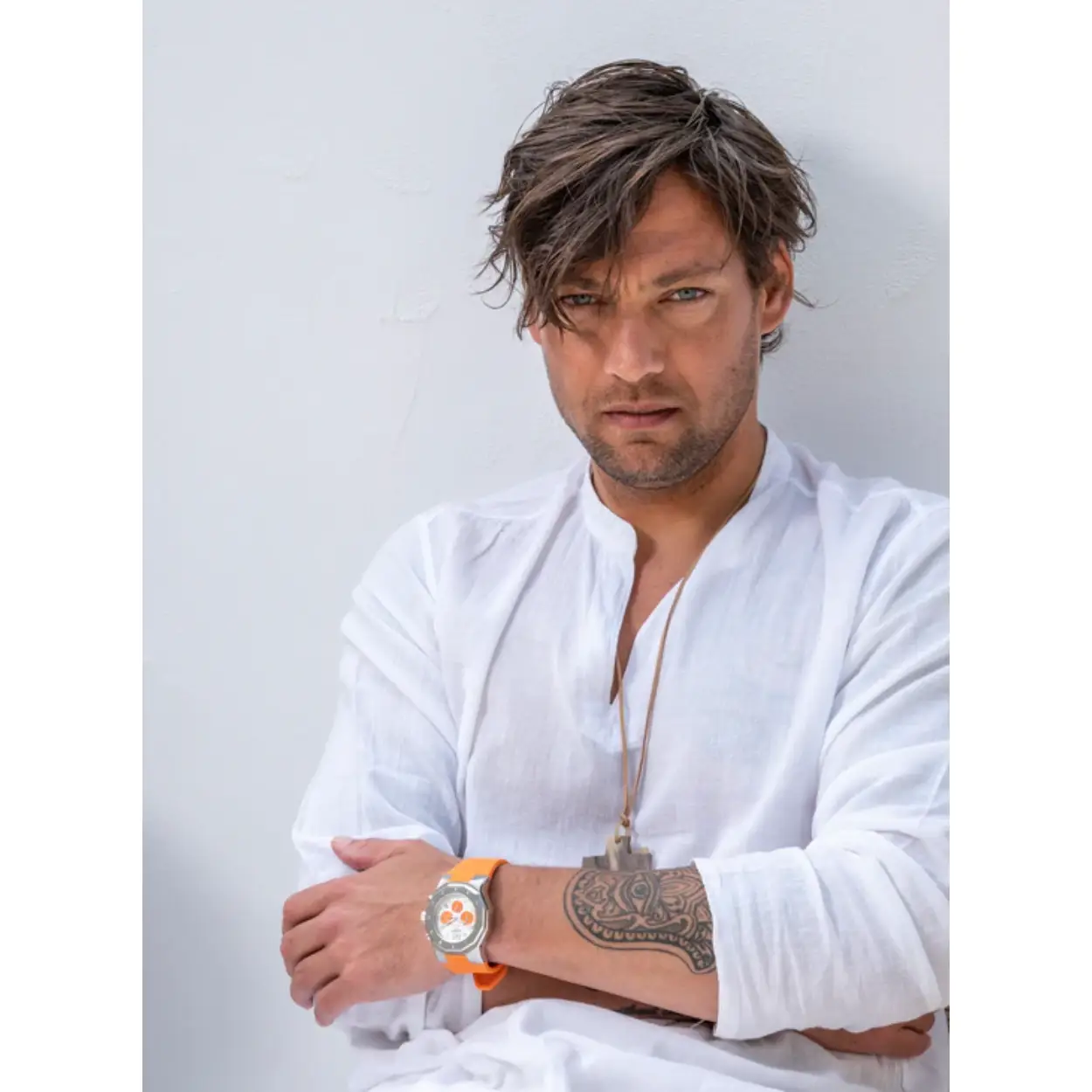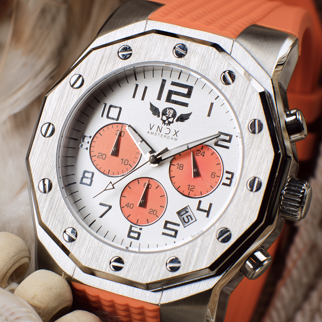 Een stoer horloge voor hem en haar, uitgevoerd met een mat geborstelde stalen kast, gecombineerd met de flexibele en comfortabele oranje siliconen band.