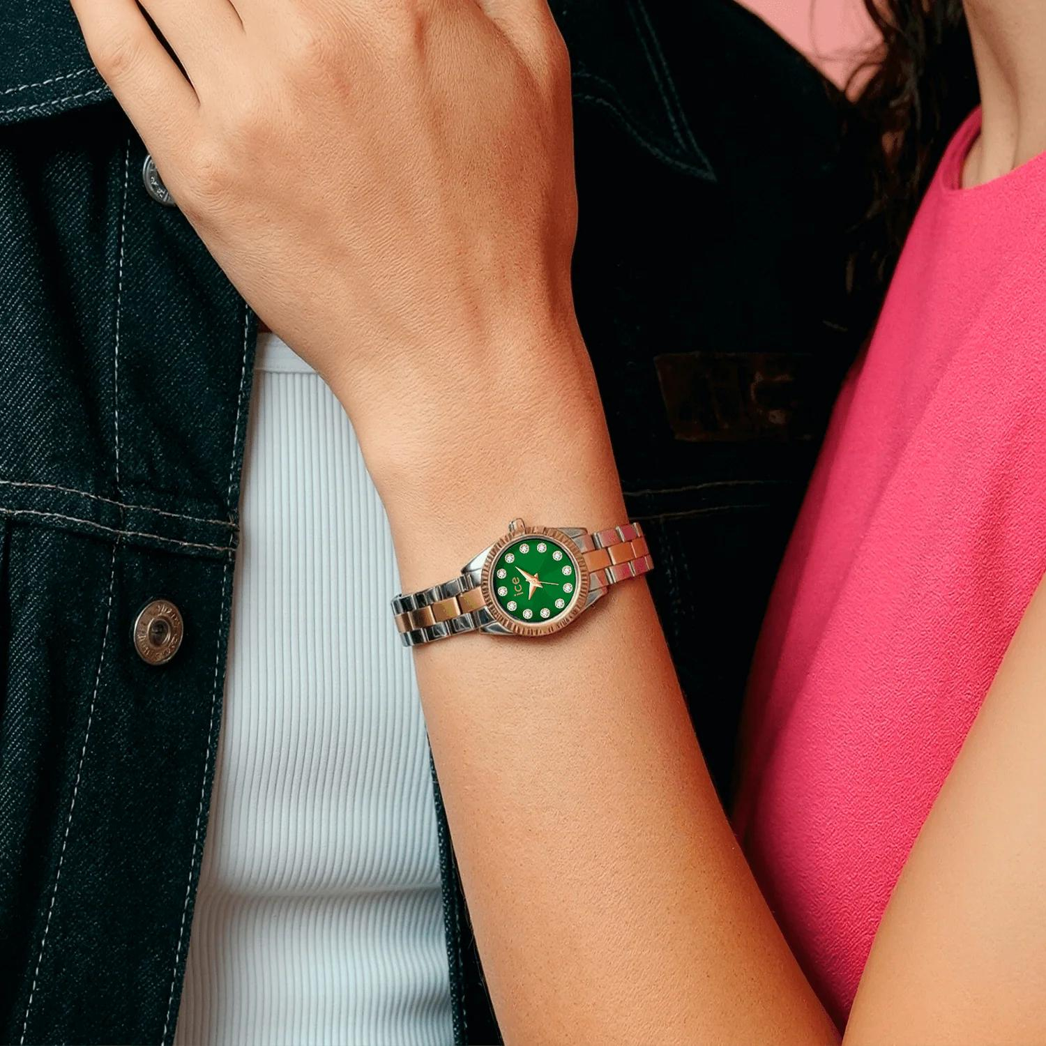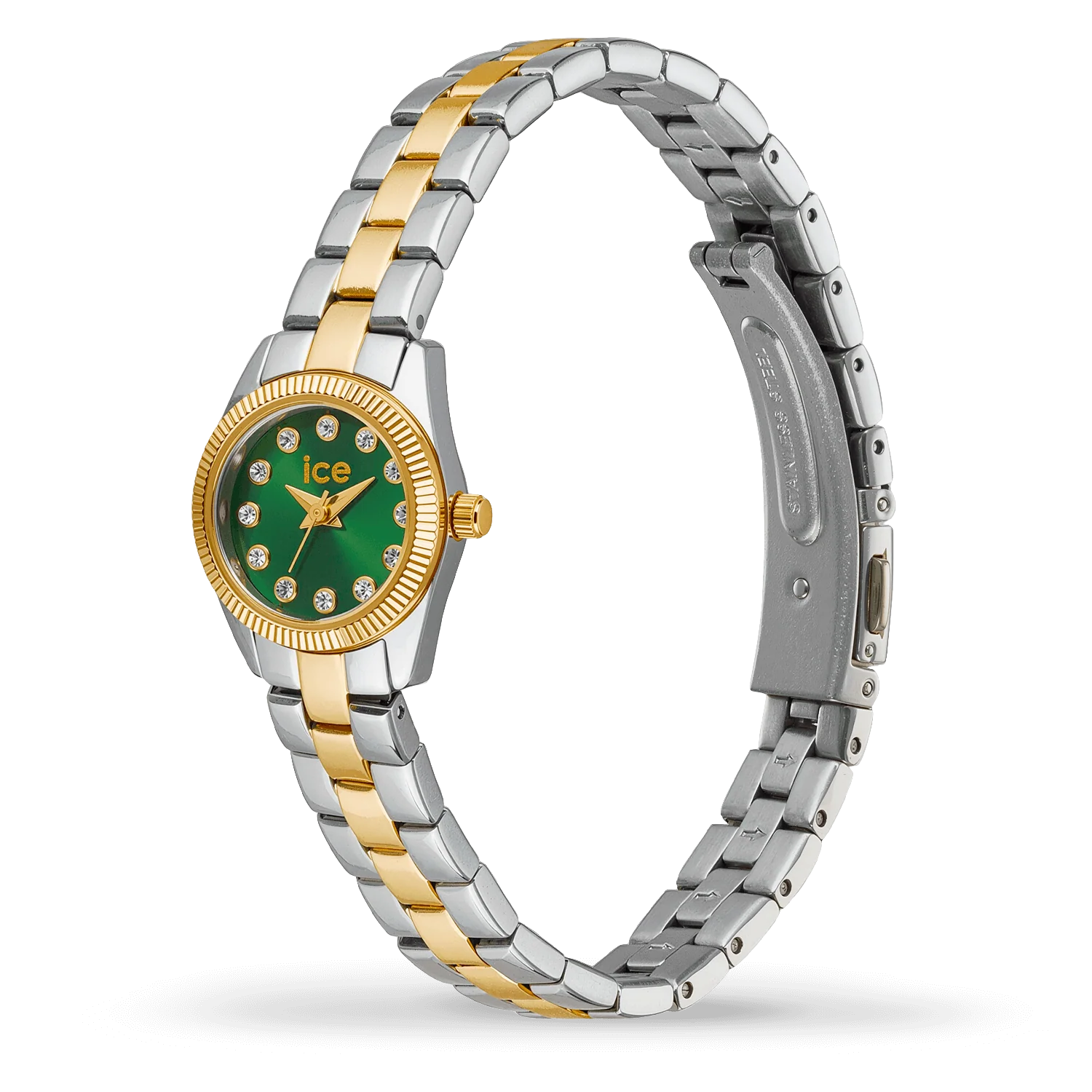 De ICE Horloge Mimi (modelnummer 025538) is een elegante polshorloge met een roestvrijstalen kast en band in goud-zilver. Het heeft een groen wijzerplaat met decoratieve diamanten. De analoge quartz uurwerk is waterbestendig tot niveau 3. Zonder datum- of lichtfunctie, maar wel nikkelvrij. Perfect te dragen bij formele en alledaagse gelegenheden.