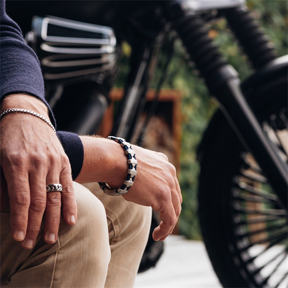 De iXXXi Men armband Chili is gemaakt van een combinatie van stainless steel in de kleur mat zilver en gewaxt koord. De bracelet heeft een plat design, met schakels in een ruitachtige vorm. Aan de buitenkant van de schakels lopen twee dikke gewaxte koorden in de kleur blauw. Deze koorden vormen samen met de schakels het opvallende design van de armband Chili. Bracelet Chili heeft een langwerpige stalen sluiting die perfect past bij het design van de armband. De iXXXi armband Chili is verkrijgbaar in de maten 19, 20, 21 en 22. Mix en match met verschillende armbanden uit de iXXXi Men collectie en maak zo jouw look compleet!