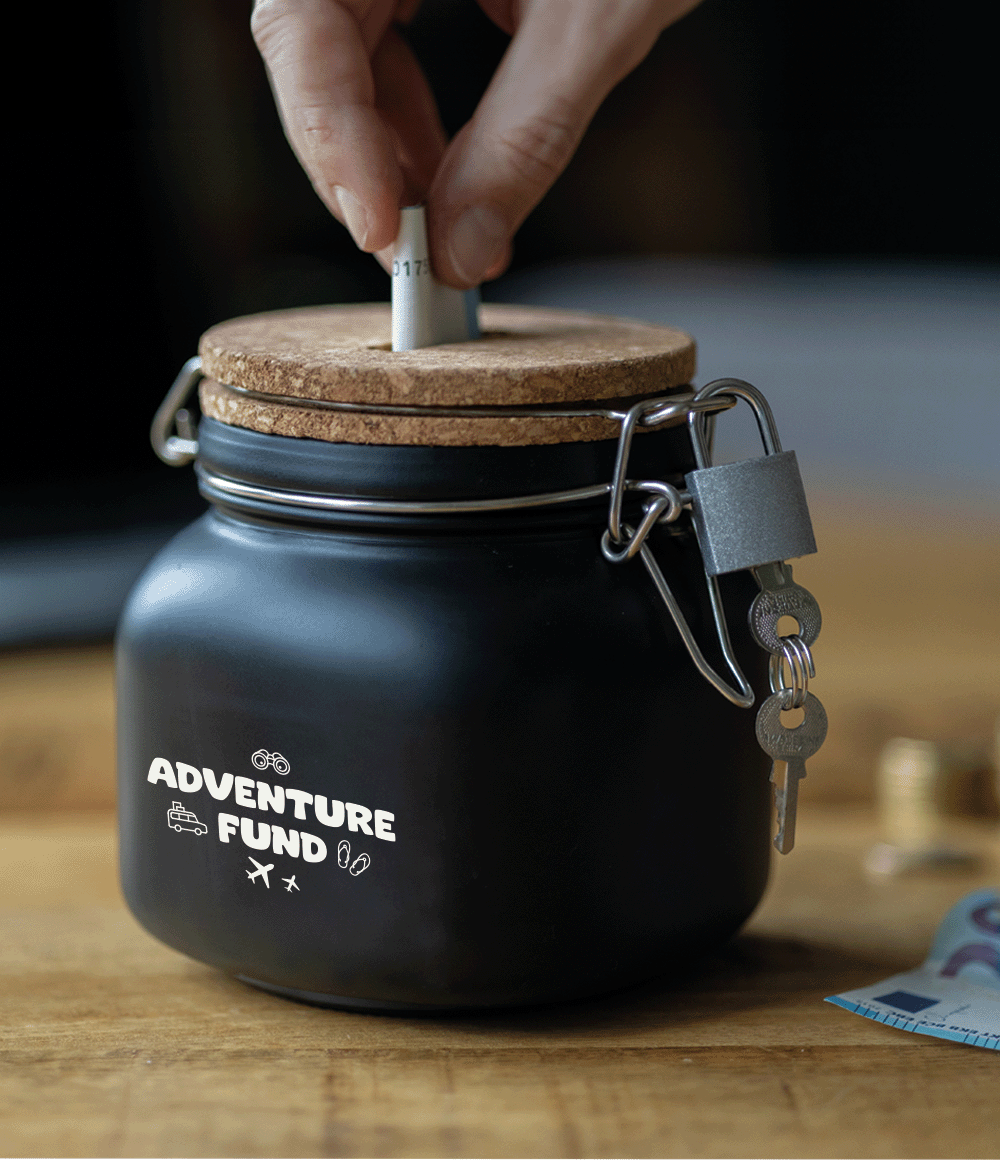 De luxe spaarpotten van Paper Dreams zijn perfecte cadeaus voor bijvoorbeeld Vaderdag, Moederdag of bijvoorbeeld een verjaardag. Deze luxe spaarpot - adventure is gemaakt van glas, is zwart van kleur