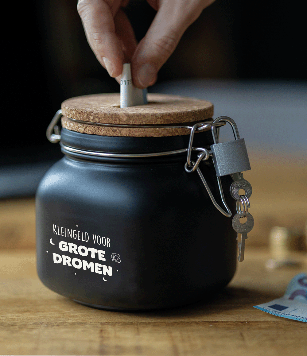 De luxe spaarpotten van Paper Dreams zijn perfecte cadeaus voor bijvoorbeeld Vaderdag, Moederdag of bijvoorbeeld een verjaardag. Deze luxe spaarpot - grote dromen is gemaakt van glas, is zwart van kleur