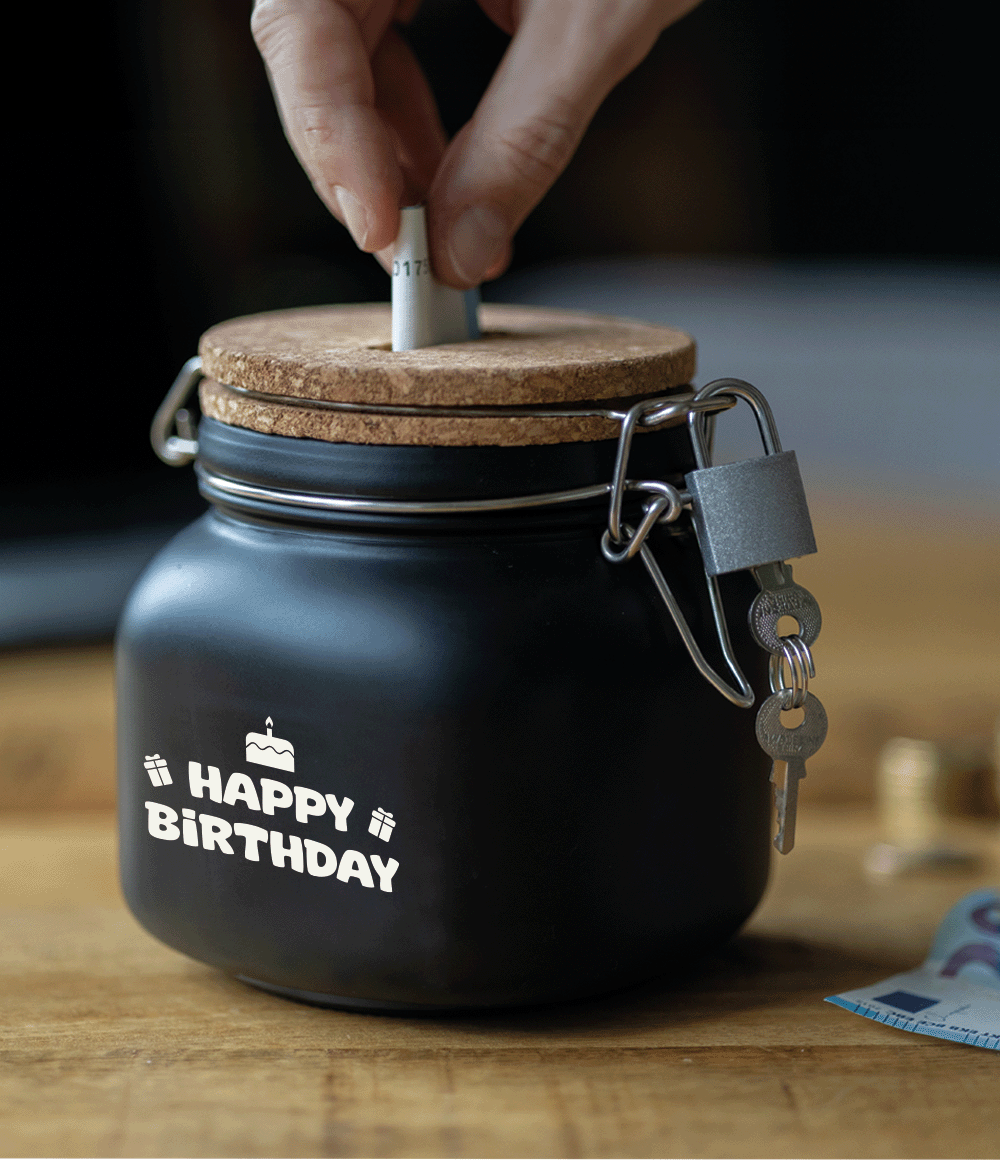 De luxe spaarpotten van Paper Dreams zijn perfecte cadeaus voor bijvoorbeeld Vaderdag, Moederdag of bijvoorbeeld een verjaardag. Deze luxe spaarpot - happy birthday is gemaakt van glas, is zwart van kleur