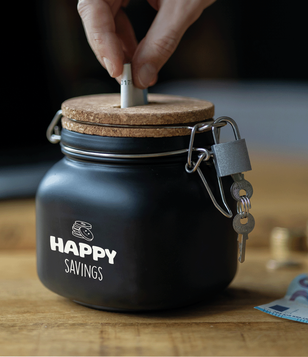 De luxe spaarpotten van Paper Dreams zijn perfecte cadeaus voor bijvoorbeeld Vaderdag, Moederdag of bijvoorbeeld een verjaardag. Deze luxe spaarpot - happy savings is gemaakt van glas, is zwart van kleur