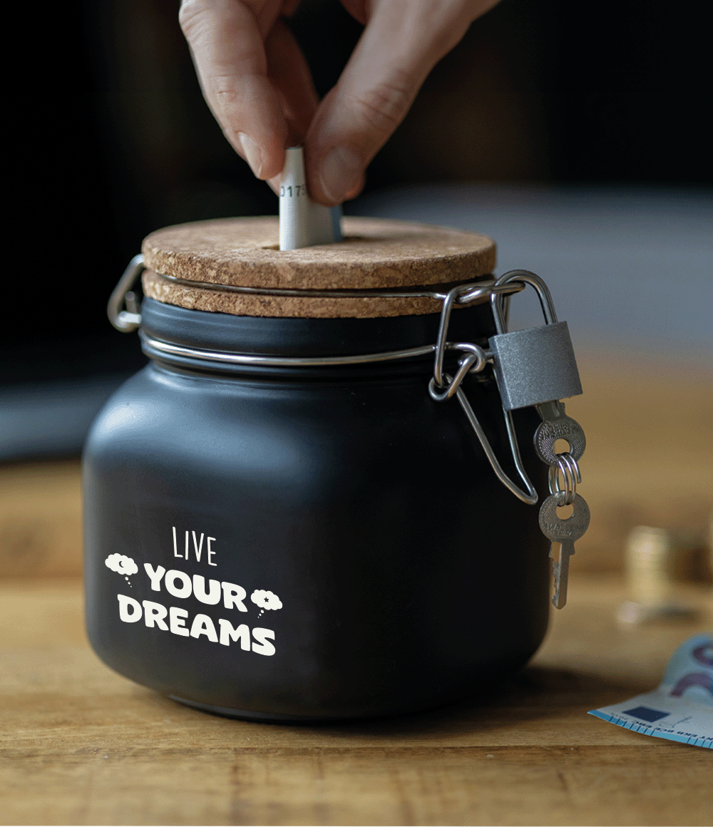 De luxe spaarpotten van Paper Dreams zijn perfecte cadeaus voor bijvoorbeeld Vaderdag, Moederdag of bijvoorbeeld een verjaardag. Deze luxe spaarpot - live your dreams is gemaakt van glas, is zwart van kleur