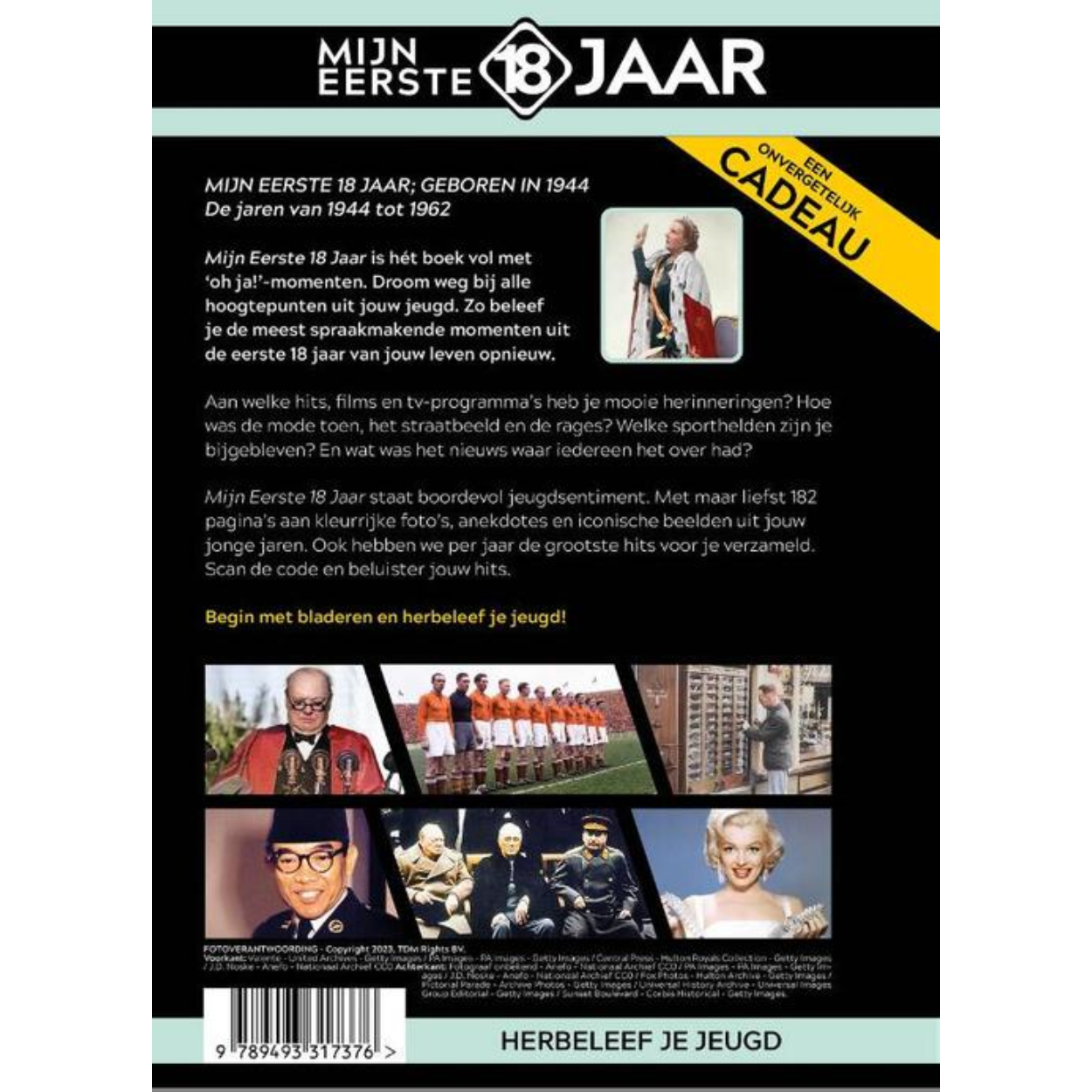 MIJN EERSTE 18 JAAR; GEBOREN IN 1944 De jaren van 1944 tot 1962 Mijn Eerste 18 Jaar is hét boek vol met ‘oh ja!’-momenten. Droom weg bij alle hoogtepunten uit jouw jeugd. Zo beleef je de meest spraakmakende momenten uit de eerste 18 jaar van jouw leven opnieuw. Aan welke hits, films en tv-programma’s heb je mooie herinneringen? Hoe was de mode toen, het straatbeeld en de rages? Welke sporthelden zijn je bijgebleven? En wat was het nieuws waar iedereen het over had? Mijn Eerste 18 Jaar staat boordevol jeugdsentiment. Met maar liefst 182 pagina’s aan kleurrijke foto’s, anekdotes en iconische beelden uit jouw jonge jaren. Ook hebben we per jaar de grootste hits voor je verzameld. Scan de code en beluister jouw hits. Begin met bladeren en herbeleef je jeugd!