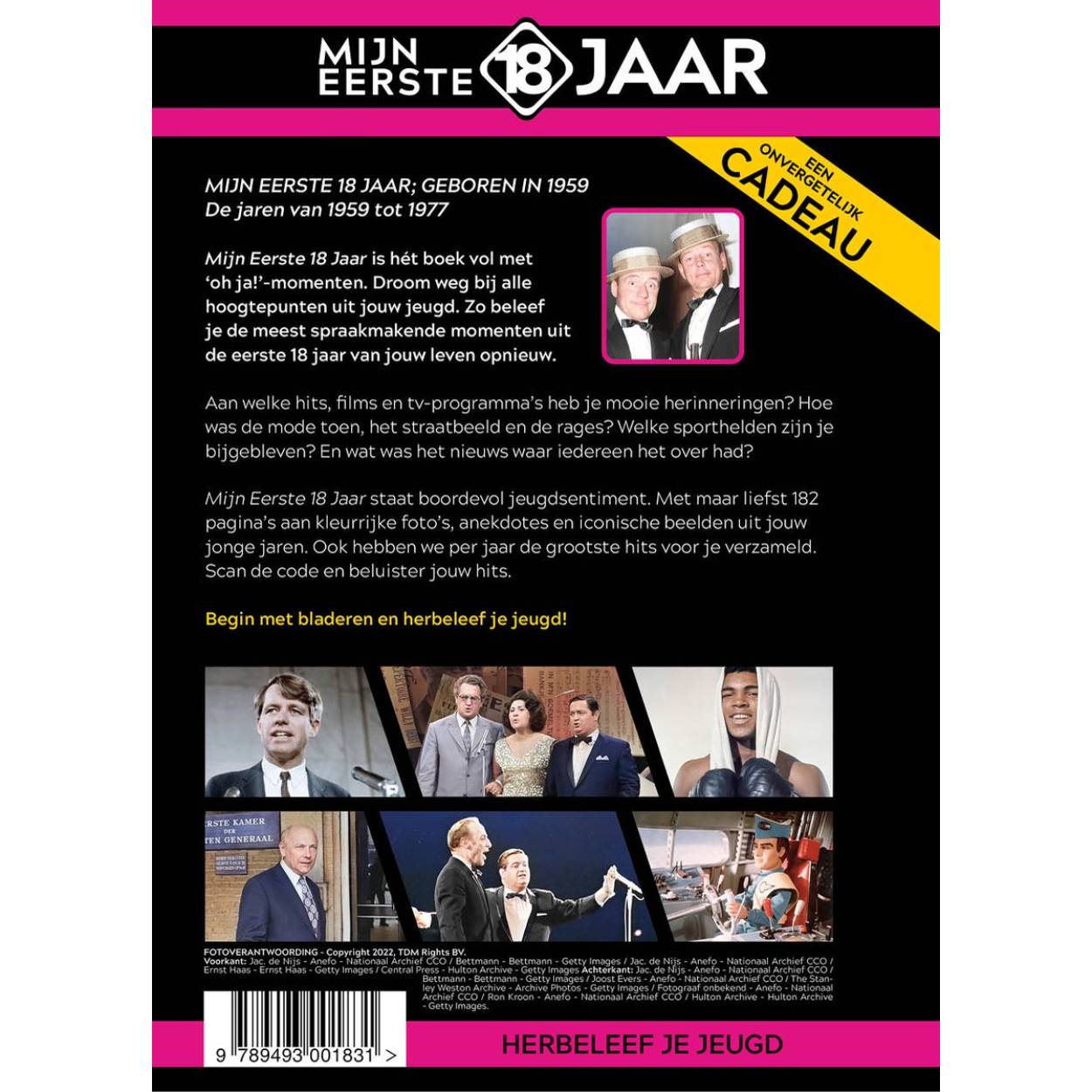 MIJN EERSTE 18 JAAR; GEBOREN IN 1959 De jaren van 1959 tot 1977 Mijn Eerste 18 Jaar is hét boek vol met ‘oh ja!’-momenten. Droom weg bij alle hoogtepunten uit jouw jeugd. Zo beleef je de meest spraakmakende momenten uit de eerste 18 jaar van jouw leven opnieuw. Aan welke hits, films en tv-programma’s heb je mooie herinneringen? Hoe was de mode toen, het straatbeeld en de rages? Welke sporthelden zijn je bijgebleven? En wat was het nieuws waar iedereen het over had? Mijn Eerste 18 Jaar staat boordevol jeugdsentiment. Met maar liefst 182 pagina’s aan kleurrijke foto’s, anekdotes en iconische beelden uit jouw jonge jaren. Ook hebben we per jaar de grootste hits voor je verzameld. Scan de code en beluister jouw hits. Begin met bladeren en herbeleef je jeugd!