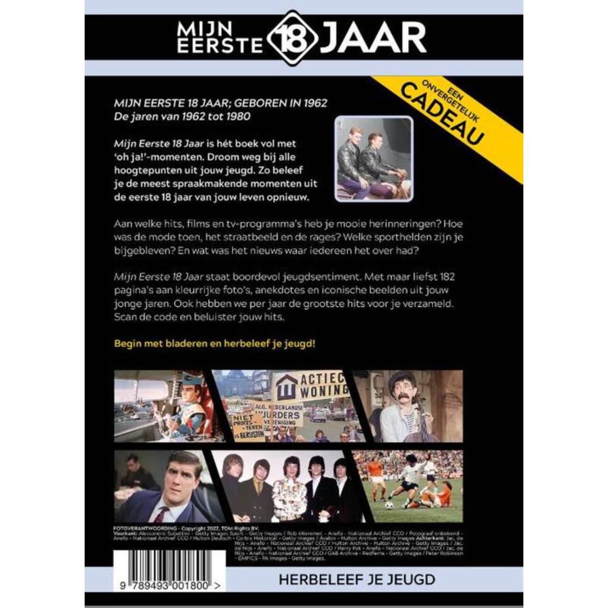 MIJN EERSTE 18 JAAR; GEBOREN IN 1962 De jaren van 1962 tot 1980 Mijn Eerste 18 Jaar is hét boek vol met ‘oh ja!’-momenten. Droom weg bij alle hoogtepunten uit jouw jeugd. Zo beleef je de meest spraakmakende momenten uit de eerste 18 jaar van jouw leven opnieuw. Aan welke hits, films en tv-programma’s heb je mooie herinneringen? Hoe was de mode toen, het straatbeeld en de rages? Welke sporthelden zijn je bijgebleven? En wat was het nieuws waar iedereen het over had? Mijn Eerste 18 Jaar staat boordevol jeugdsentiment. Met maar liefst 182 pagina’s aan kleurrijke foto’s, anekdotes en iconische beelden uit jouw jonge jaren. Ook hebben we per jaar de grootste hits voor je verzameld. Scan de code en beluister jouw hits. Begin met bladeren en herbeleef je jeugd!