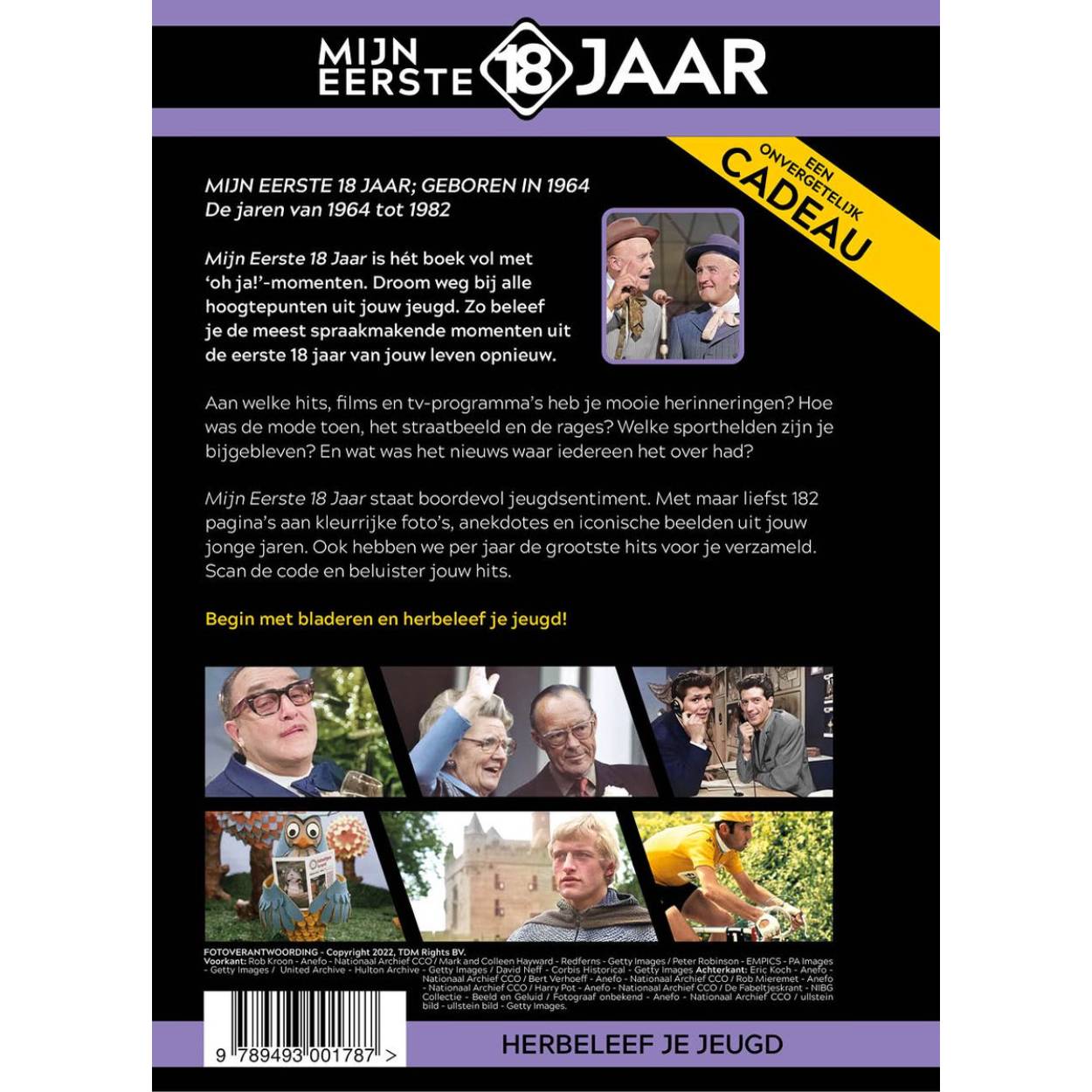 MIJN EERSTE 18 JAAR; GEBOREN IN 1964 De jaren van 1964 tot 1982 Mijn Eerste 18 Jaar is hét boek vol met ‘oh ja!’-momenten. Droom weg bij alle hoogtepunten uit jouw jeugd. Zo beleef je de meest spraakmakende momenten uit de eerste 18 jaar van jouw leven opnieuw. Aan welke hits, films en tv-programma’s heb je mooie herinneringen? Hoe was de mode toen, het straatbeeld en de rages? Welke sporthelden zijn je bijgebleven? En wat was het nieuws waar iedereen het over had? Mijn Eerste 18 Jaar staat boordevol jeugdsentiment. Met maar liefst 182 pagina’s aan kleurrijke foto’s, anekdotes en iconische beelden uit jouw jonge jaren. Ook hebben we per jaar de grootste hits voor je verzameld. Scan de code en beluister jouw hits. Begin met bladeren en herbeleef je jeugd!