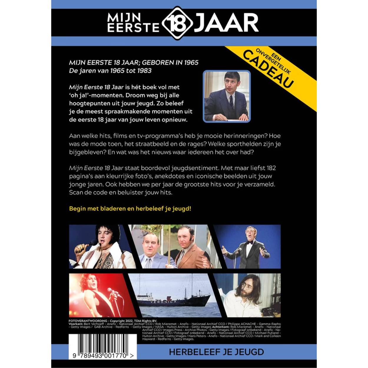 MIJN EERSTE 18 JAAR; GEBOREN IN 1965 De jaren van 1965 tot 1983 Mijn Eerste 18 Jaar is hét boek vol met ‘oh ja!’-momenten. Droom weg bij alle hoogtepunten uit jouw jeugd. Zo beleef je de meest spraakmakende momenten uit de eerste 18 jaar van jouw leven opnieuw. Aan welke hits, films en tv-programma’s heb je mooie herinneringen? Hoe was de mode toen, het straatbeeld en de rages? Welke sporthelden zijn je bijgebleven? En wat was het nieuws waar iedereen het over had? Mijn Eerste 18 Jaar staat boordevol jeugdsentiment. Met maar liefst 182 pagina’s aan kleurrijke foto’s, anekdotes en iconische beelden uit jouw jonge jaren. Ook hebben we per jaar de grootste hits voor je verzameld. Scan de code en beluister jouw hits. Begin met bladeren en herbeleef je jeugd!