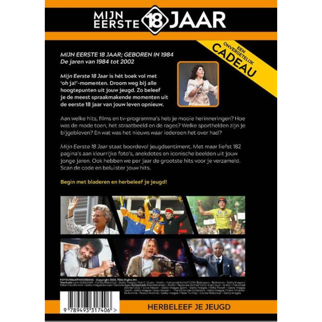 MIJN EERSTE 18 JAAR; GEBOREN IN 1984 De jaren van 1984 tot 2002 Mijn Eerste 18 Jaar is hét boek vol met ‘oh ja!’-momenten. Droom weg bij alle hoogtepunten uit jouw jeugd. Zo beleef je de meest spraakmakende momenten uit de eerste 18 jaar van jouw leven opnieuw. Aan welke hits, films en tv-programma’s heb je mooie herinneringen? Hoe was de mode toen, het straatbeeld en de rages? Welke sporthelden zijn je bijgebleven? En wat was het nieuws waar iedereen het over had? Mijn Eerste 18 Jaar staat boordevol jeugdsentiment. Met maar liefst 182 pagina’s aan kleurrijke foto’s, anekdotes en iconische beelden uit jouw jonge jaren. Ook hebben we per jaar de grootste hits voor je verzameld. Scan de code en beluister jouw hits. Begin met bladeren en herbeleef je jeugd!