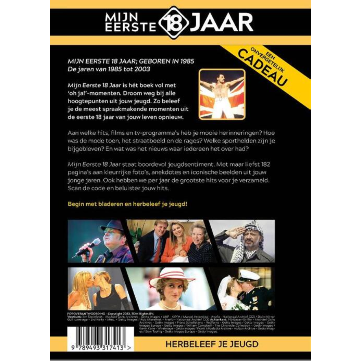 MIJN EERSTE 18 JAAR; GEBOREN IN 1985 De jaren van 1985 tot 2003 Mijn Eerste 18 Jaar is hét boek vol met ‘oh ja!’-momenten. Droom weg bij alle hoogtepunten uit jouw jeugd. Zo beleef je de meest spraakmakende momenten uit de eerste 18 jaar van jouw leven opnieuw. Aan welke hits, films en tv-programma’s heb je mooie herinneringen? Hoe was de mode toen, het straatbeeld en de rages? Welke sporthelden zijn je bijgebleven? En wat was het nieuws waar iedereen het over had? Mijn Eerste 18 Jaar staat boordevol jeugdsentiment. Met maar liefst 182 pagina’s aan kleurrijke foto’s, anekdotes en iconische beelden uit jouw jonge jaren. Ook hebben we per jaar de grootste hits voor je verzameld. Scan de code en beluister jouw hits. Begin met bladeren en herbeleef je jeugd!