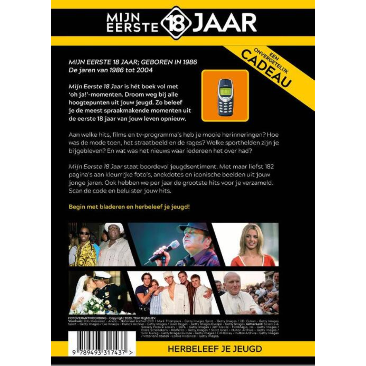 MIJN EERSTE 18 JAAR; GEBOREN IN 1986 De jaren van 1986 tot 2004 Mijn Eerste 18 Jaar is hét boek vol met ‘oh ja!’-momenten. Droom weg bij alle hoogtepunten uit jouw jeugd. Zo beleef je de meest spraakmakende momenten uit de eerste 18 jaar van jouw leven opnieuw. Aan welke hits, films en tv-programma’s heb je mooie herinneringen? Hoe was de mode toen, het straatbeeld en de rages? Welke sporthelden zijn je bijgebleven? En wat was het nieuws waar iedereen het over had? Mijn Eerste 18 Jaar staat boordevol jeugdsentiment. Met maar liefst 182 pagina’s aan kleurrijke foto’s, anekdotes en iconische beelden uit jouw jonge jaren. Ook hebben we per jaar de grootste hits voor je verzameld. Scan de code en beluister jouw hits. Begin met bladeren en herbeleef je jeugd!